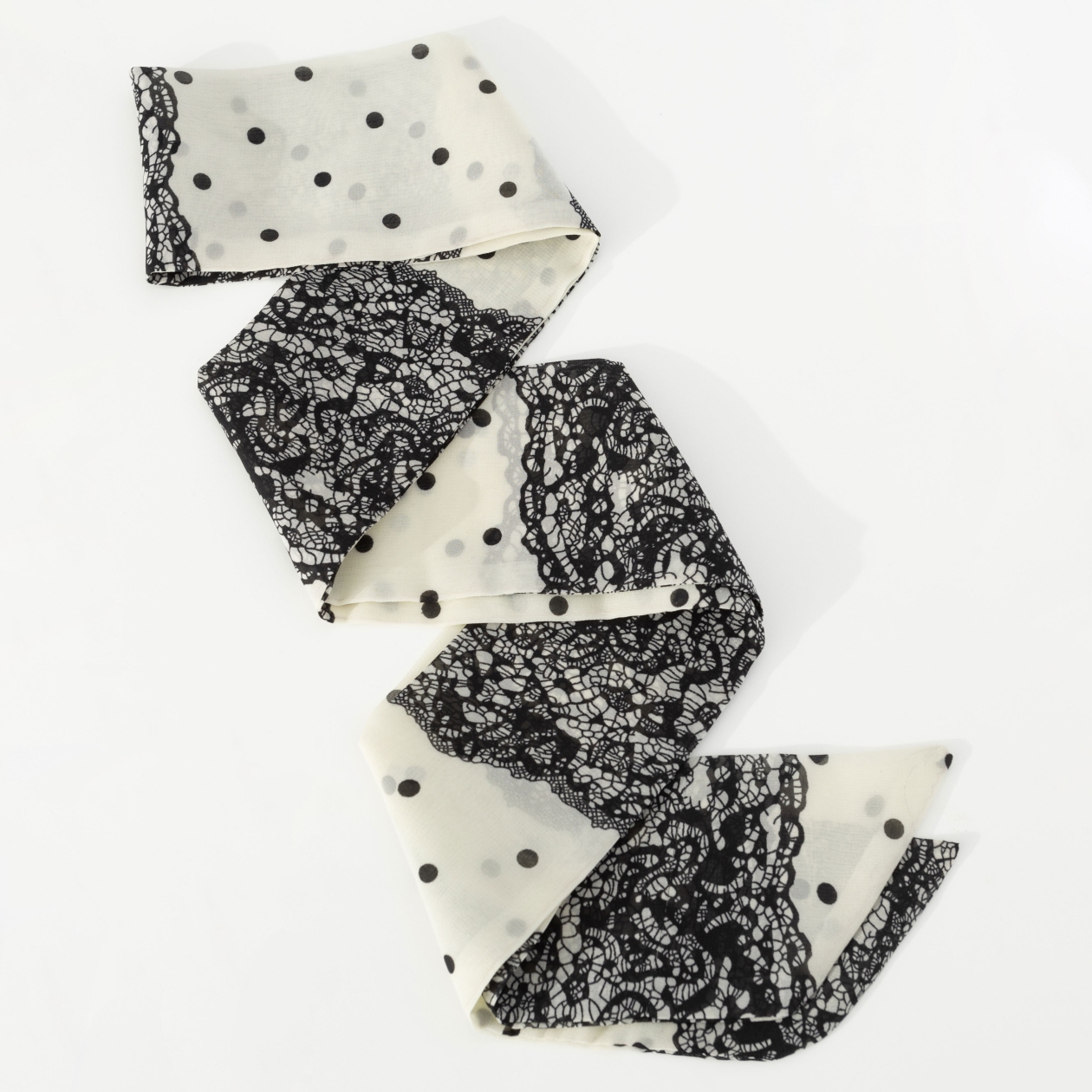 Графичный чёрно‑белый принт с кружевным орнаментом и горошком напоминает винтажные галстуки – абсолютно в духе свободы 70-х! Завяжи ленту свободным узлом вместо галстука на открытой блузе или топе на бретелях – образ сразу станет более кинематографичным и загадочным. Идеальная ширина и заострённые края позволяют завязывать аккуратные узлы у шеи, на полях шляпы или на ручках мини‑сумок, добавляя образу пикантный акцент.