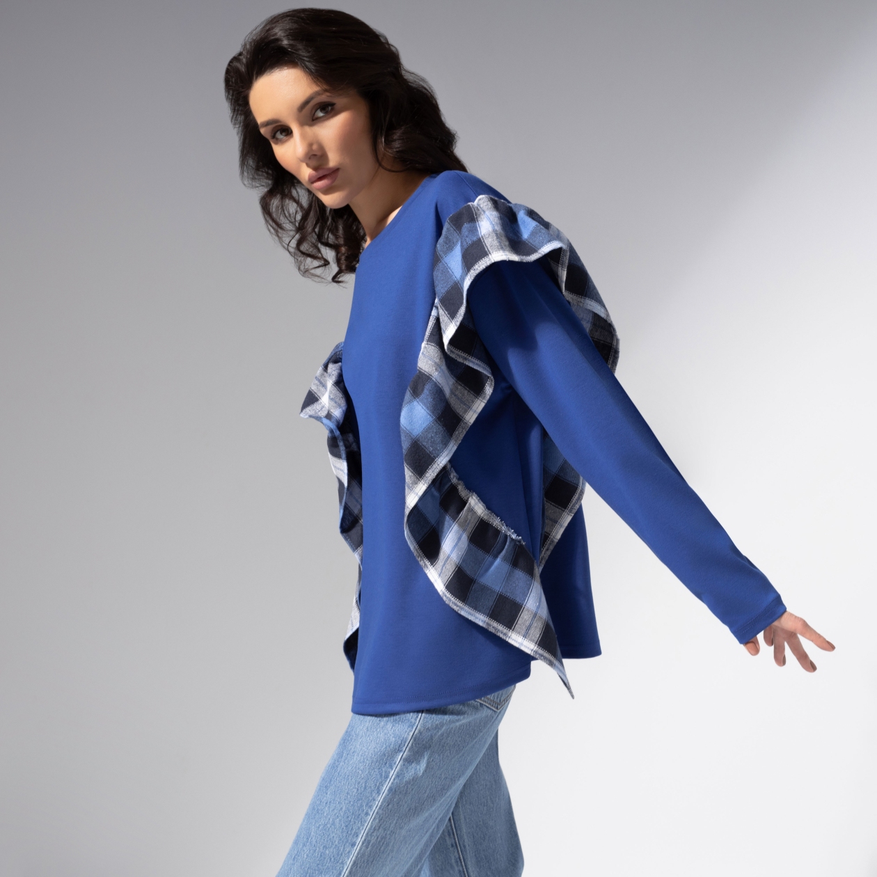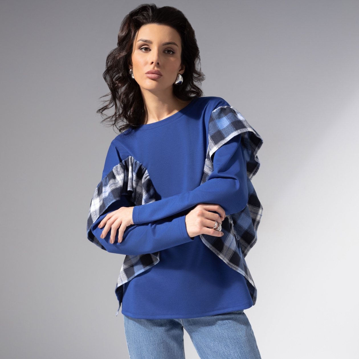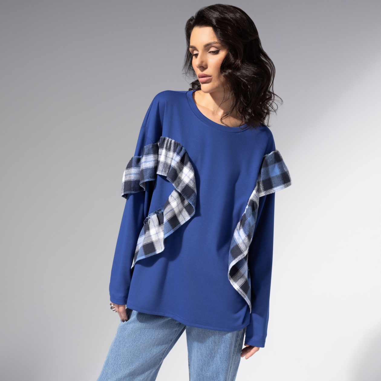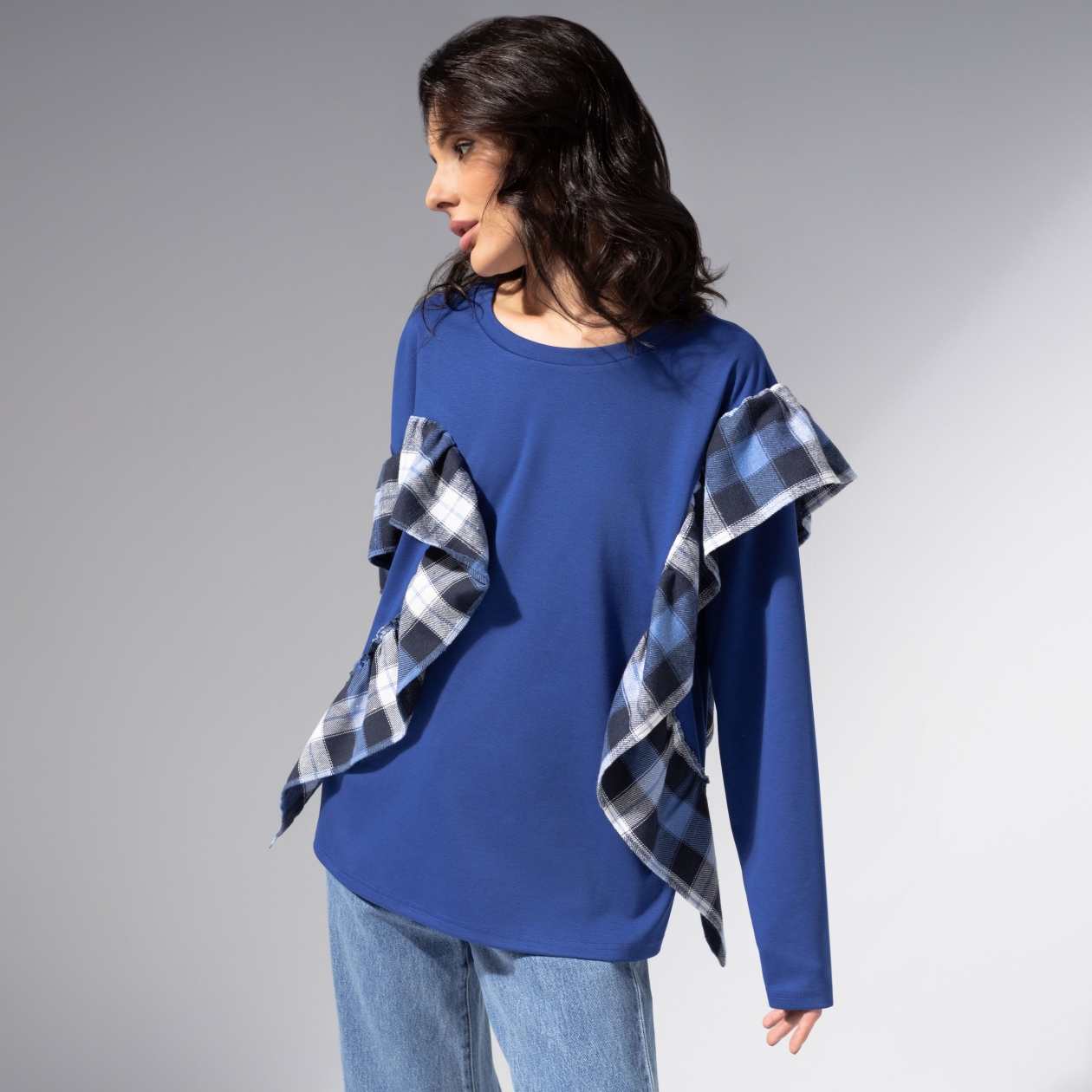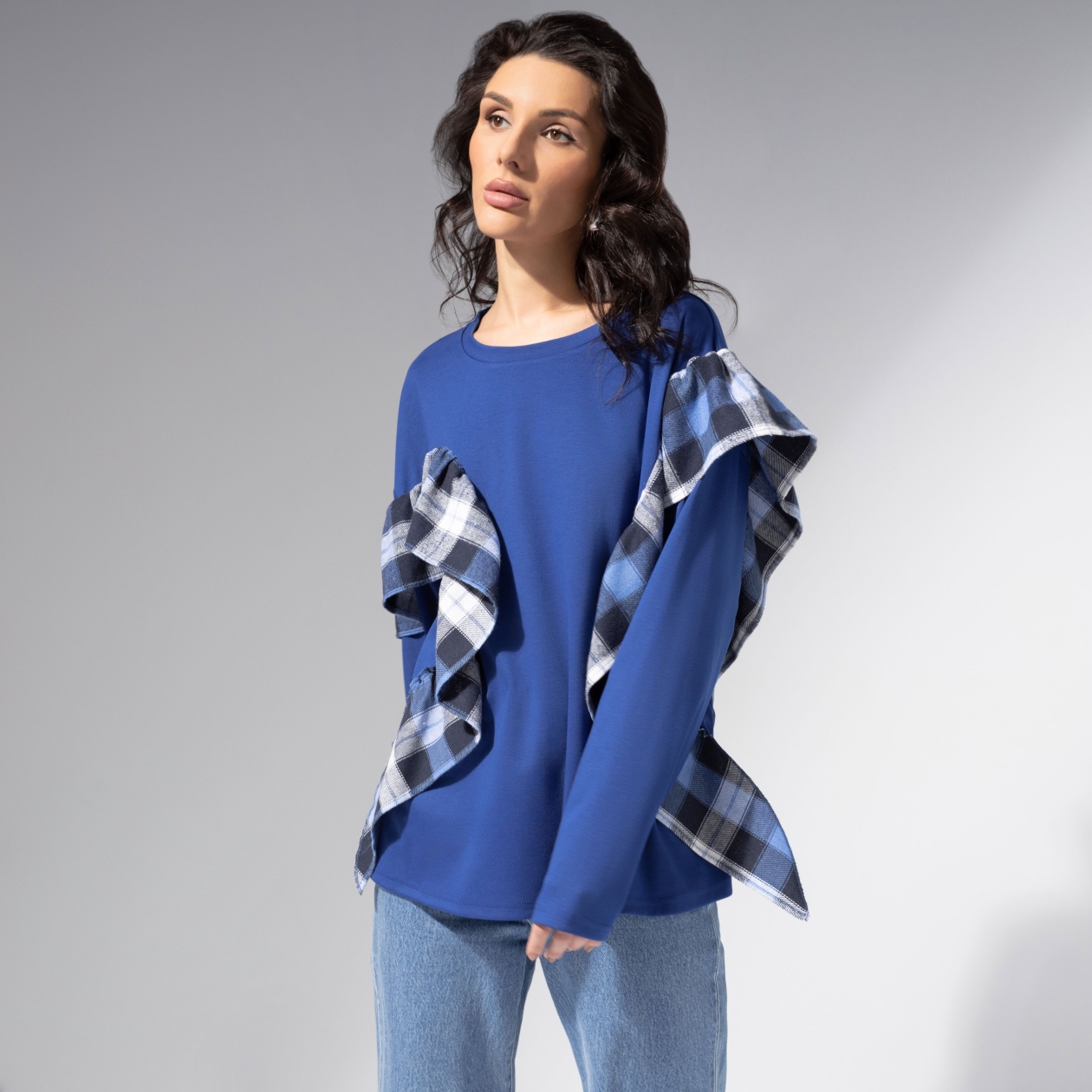 Трикотаж антипилинг. Вставки из клетчатой фланели формируют воланы по переду и рукавам. Свободный силуэт, круглый вырез, комфортная длина. Приятен к телу, сохраняет насыщенность цвета после стирок.
