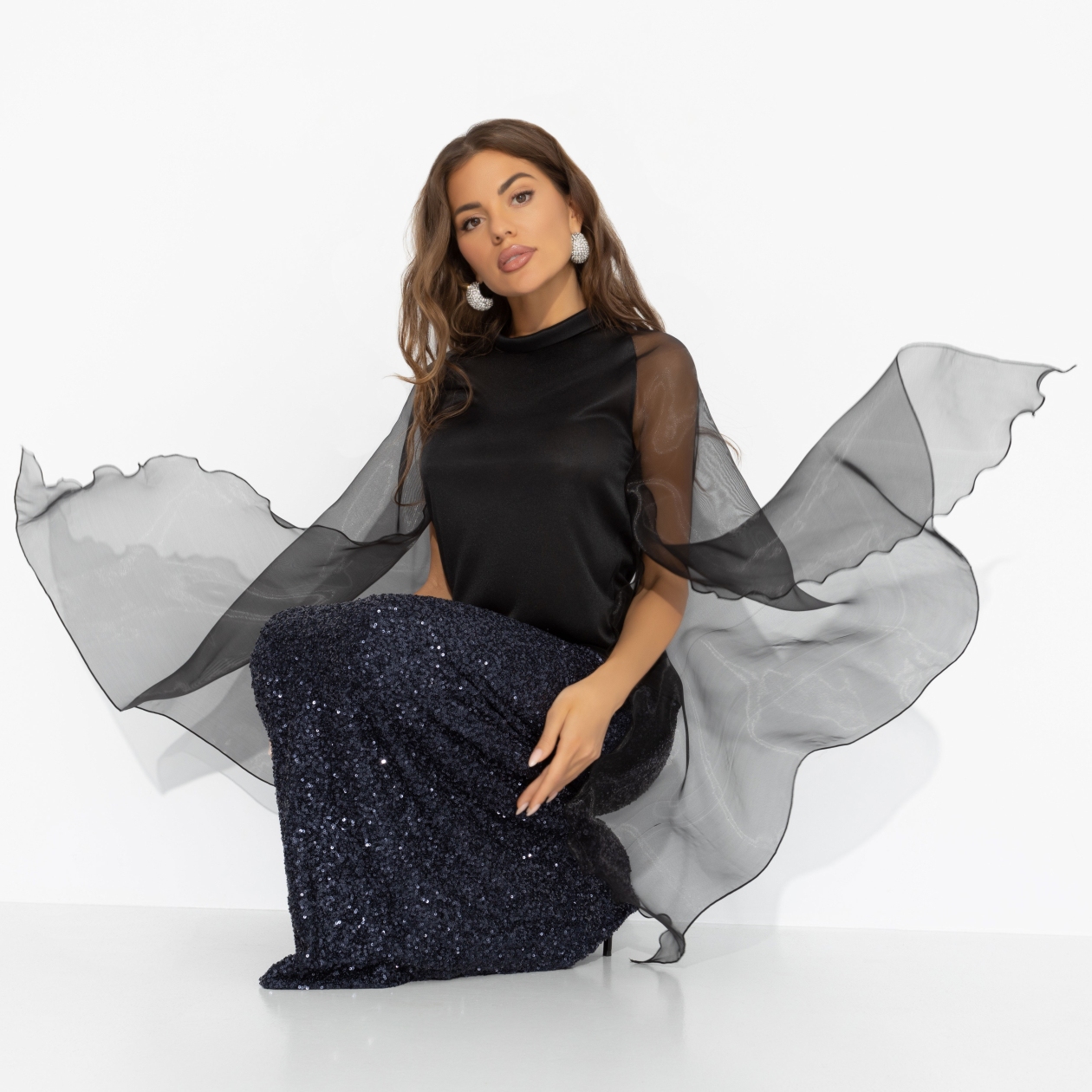 Одной рукой поведет‒ очарует, другой ‒ заманит в свои невидимые сети. Полупрозрачные рукава-крылья этой блузы превратят тебя в загадочную незнакомку: одно движение ‒ и магия в деле. Блуза из трикотажа с акцентными рукавами идеально подходит для нарядного образа. Ее легко комбинировать как с классическими брюками, так и с акцентной юбкой, расшитой пайетками. Для вашего идеального образа на Новый год.
