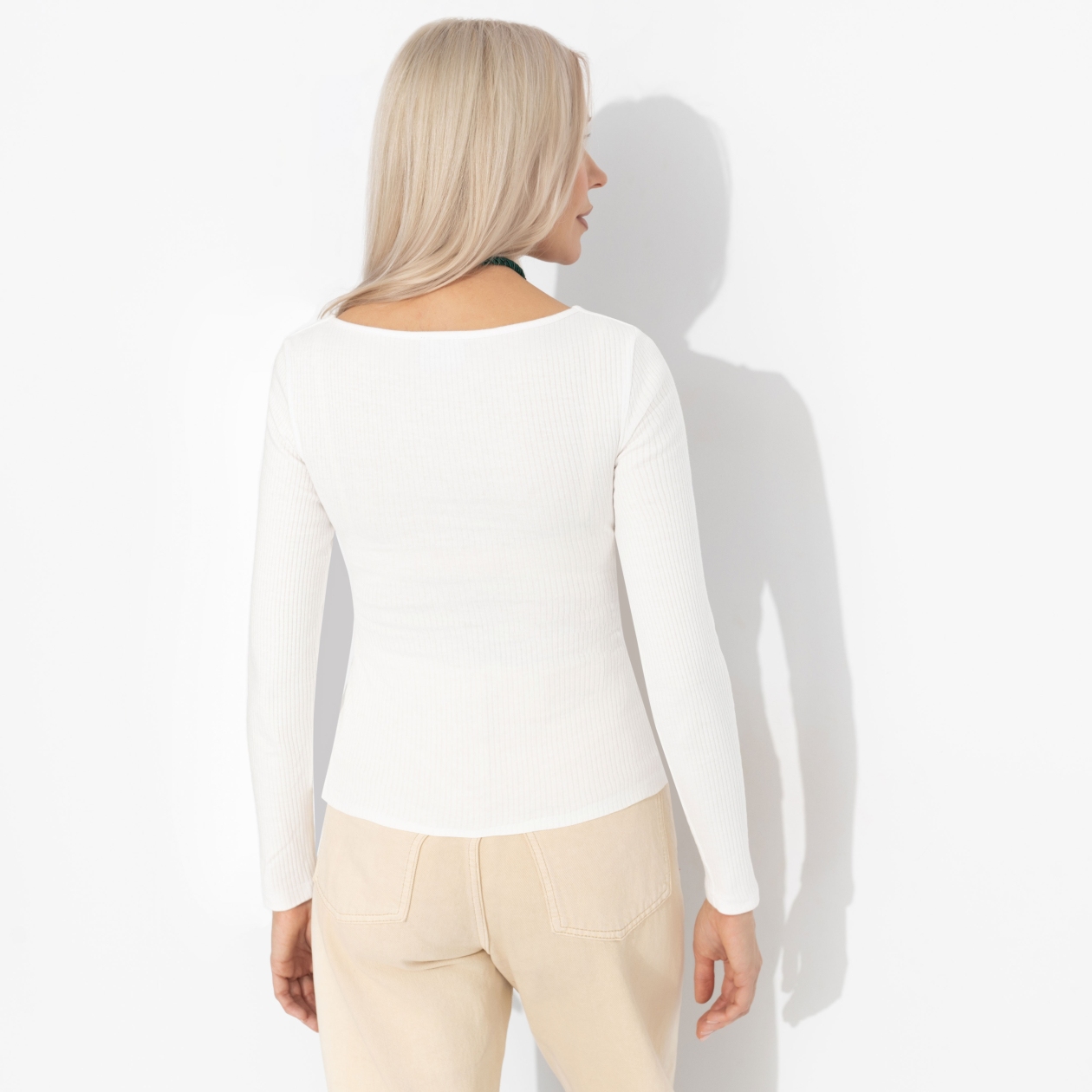 Заказ от мужской половины населения в ЧАРУТТИ – больше женственности. Заказ принят и воплощен в лонгсливе нежного молочного оттенка. Удивительно женственный, с глубокой зоной декольте и максимально комфортный. Отправляйте своим половинам! Лонгслив прилегающего силуэта. Материал изделия в рубчик. Декоративная сборка в виде узла в зоне декольте.