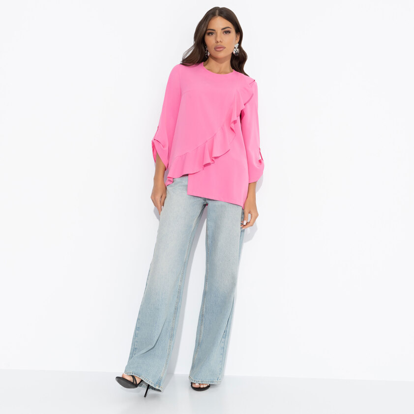 - Если хотите подчеркнуть женственность и добавить луку нотку игривости, обратите внимание на блузки с рюшами и воланами.