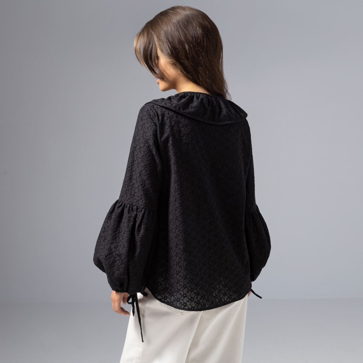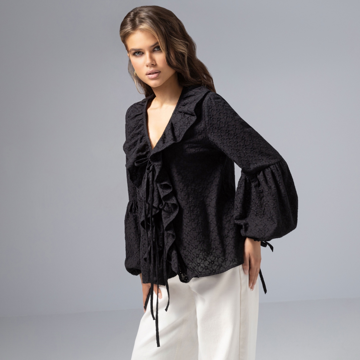 Тренд сезона – завязки, как у Ganni, плюс щедрая порция рюш и объемные рукава. Не просто блуза, а приглашение к кокетству: немного богемы, немного французской легкости, и максимум женственности. 100% хлопок, вышитый поплин с фактурным узором, рюши по краю и трендовые завязки на груди и рукавах. Свободный крой с акцентом на декольте – идеально для тех, кто ценит стиль, который точно сработает.