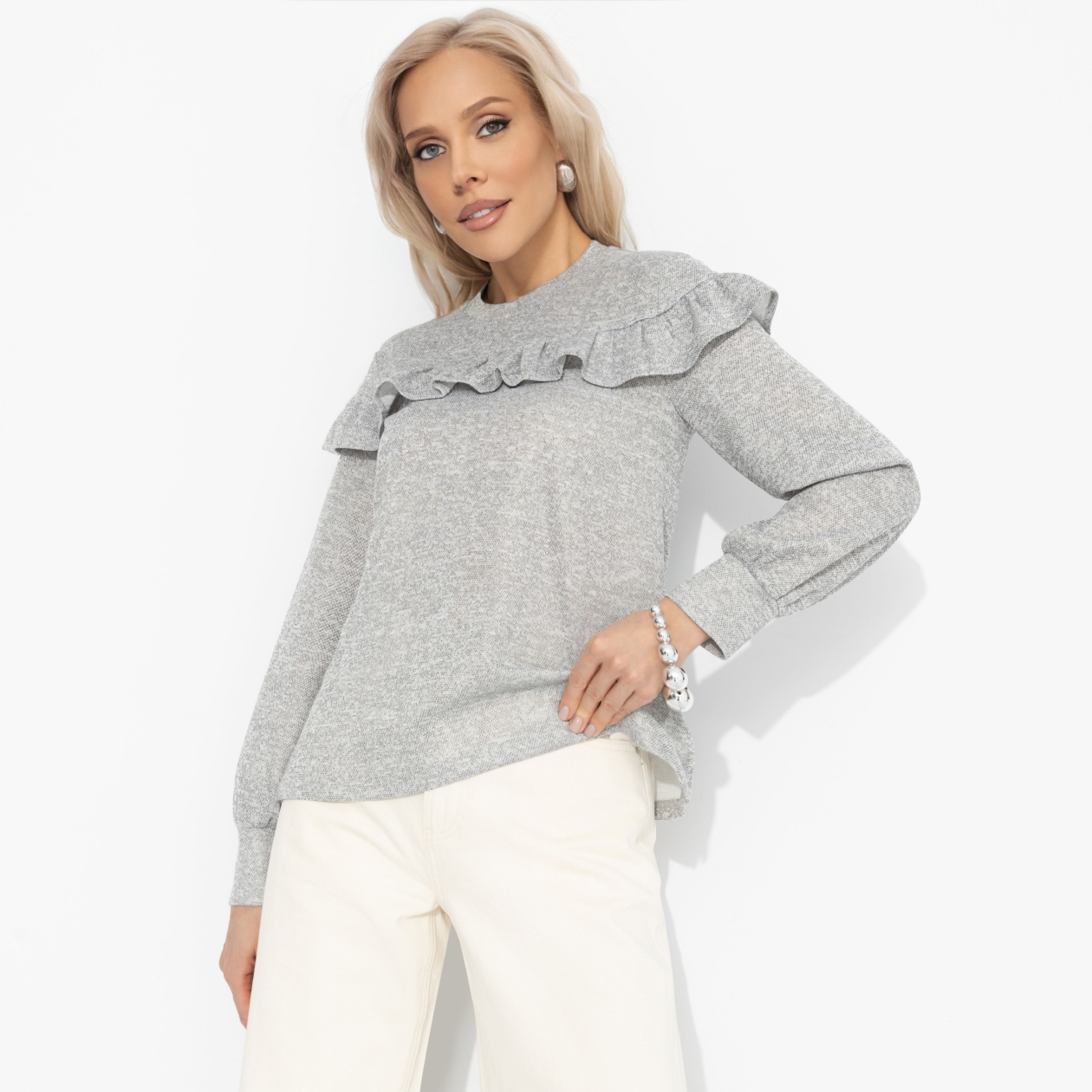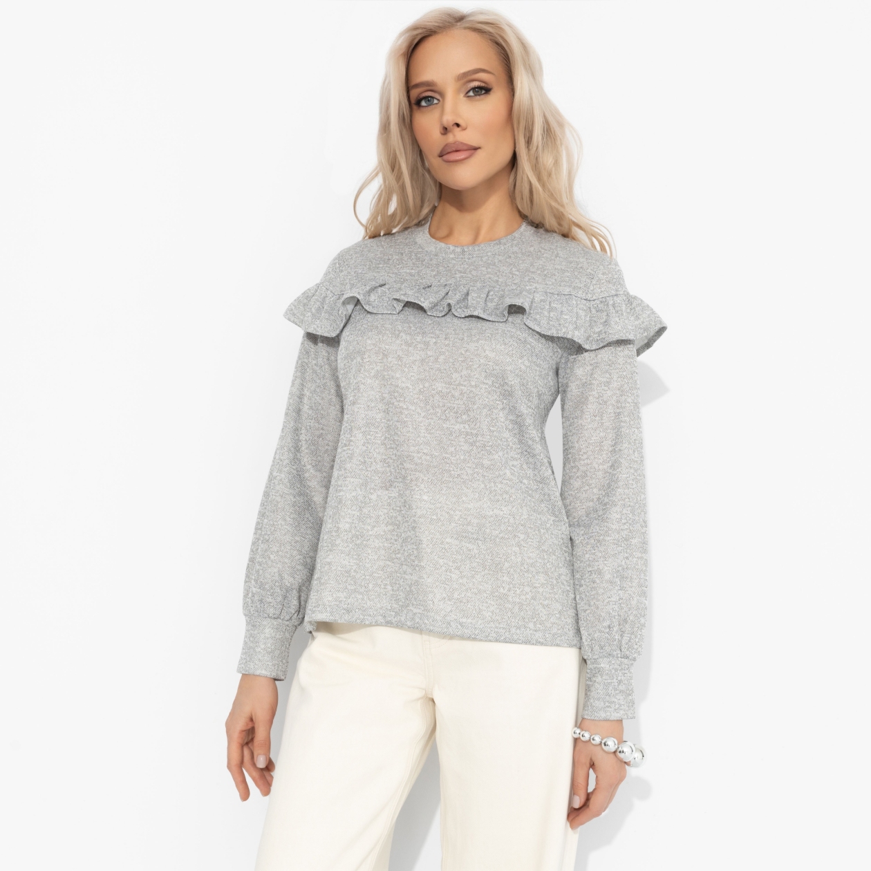Она не ищет признания – она его получает. Мягкий свитшот комфортно садится по фигуре, создавая ощущение уюта. Рюша по линии груди добавляет романтики и свежести образу. Прямой силуэт, манжеты на резинке и безупречный серый оттенок – идеальное сочетание простоты и шарма.