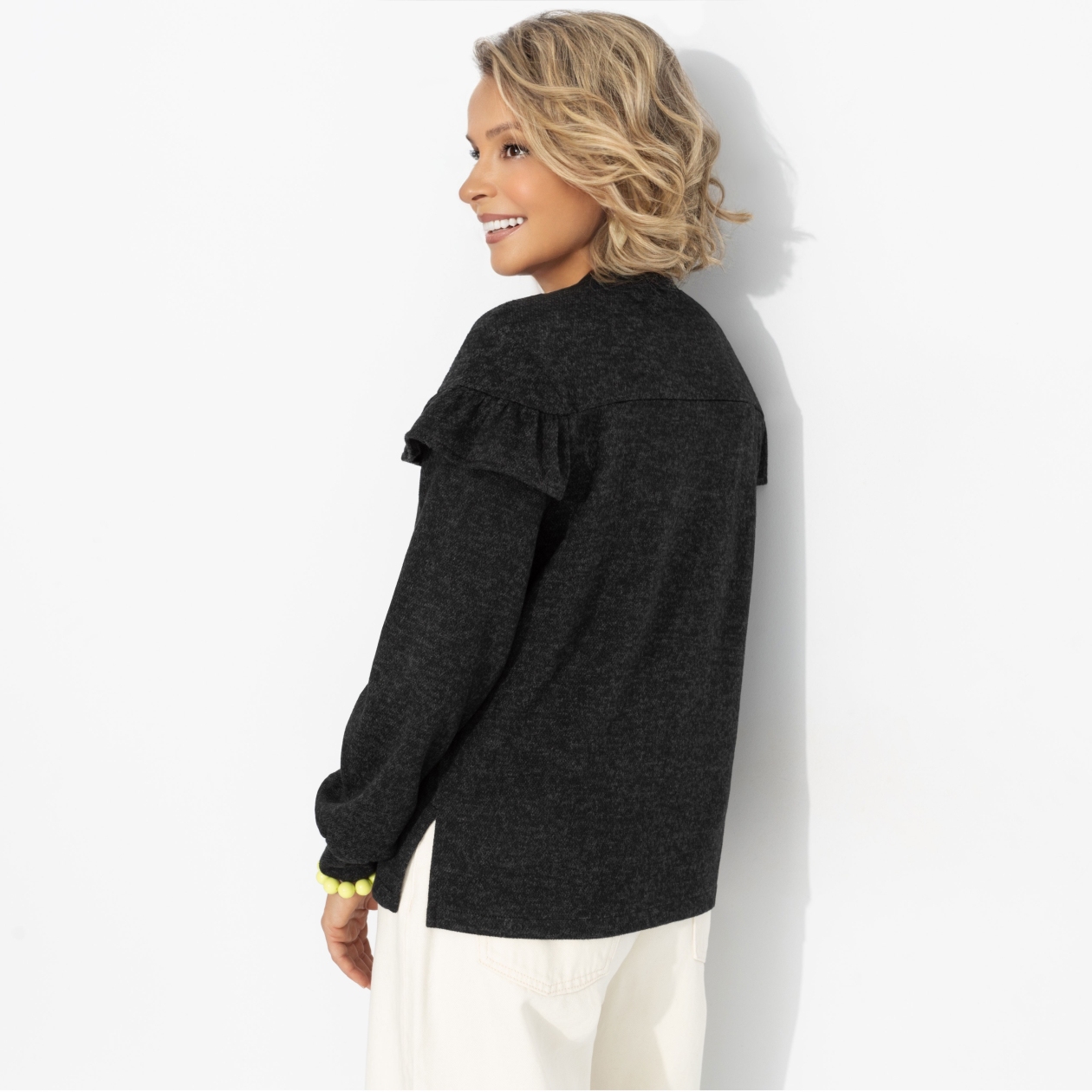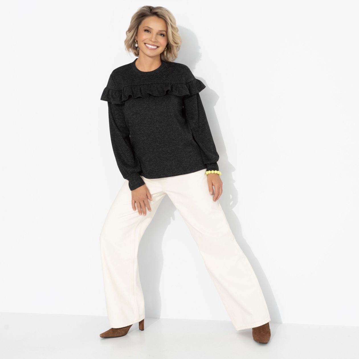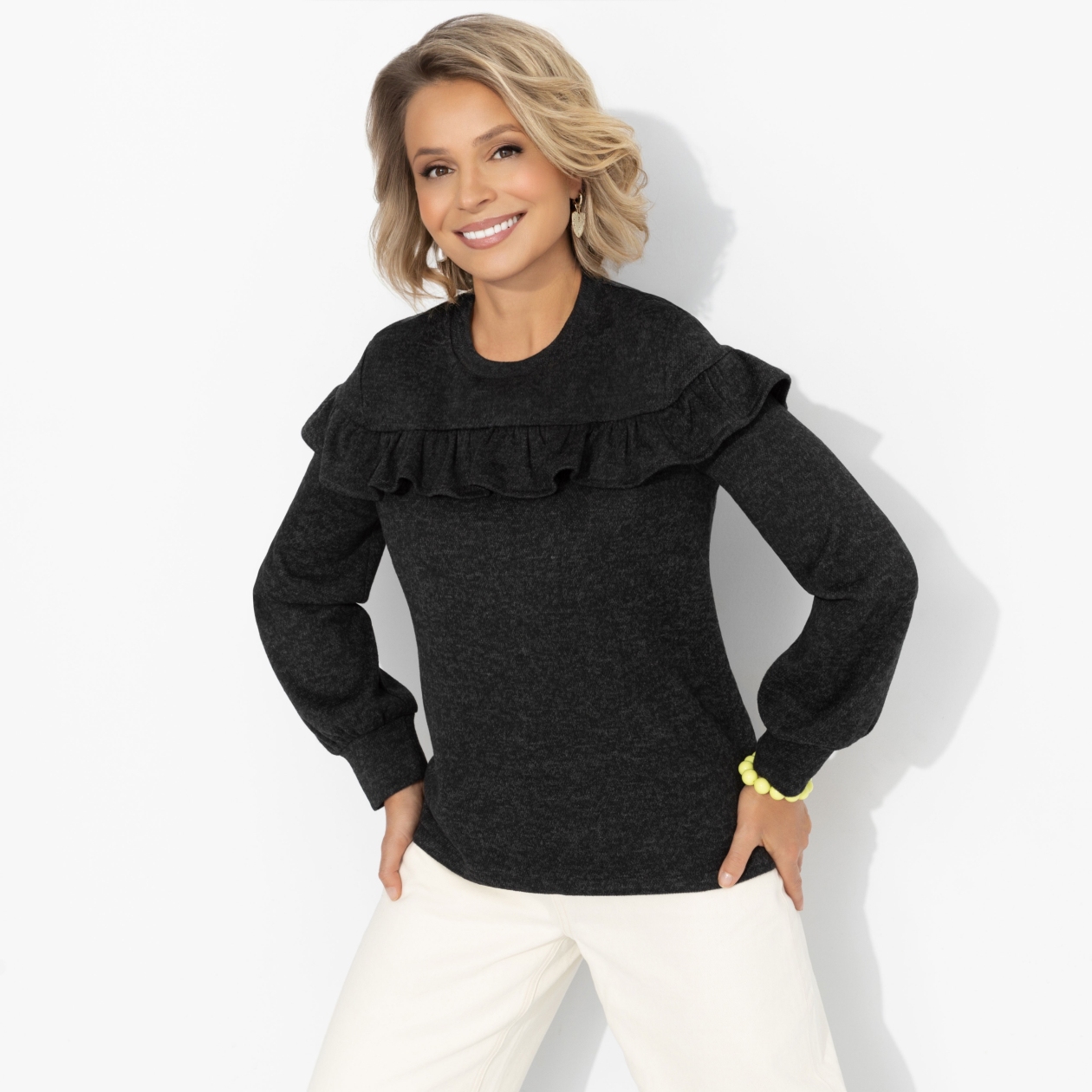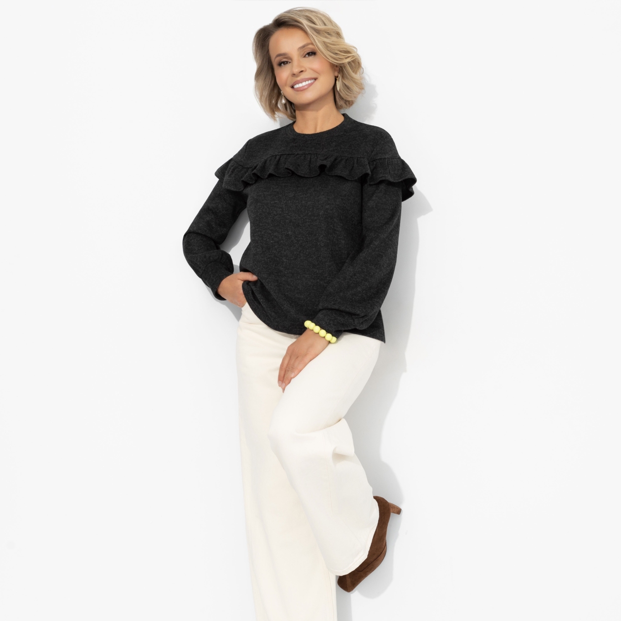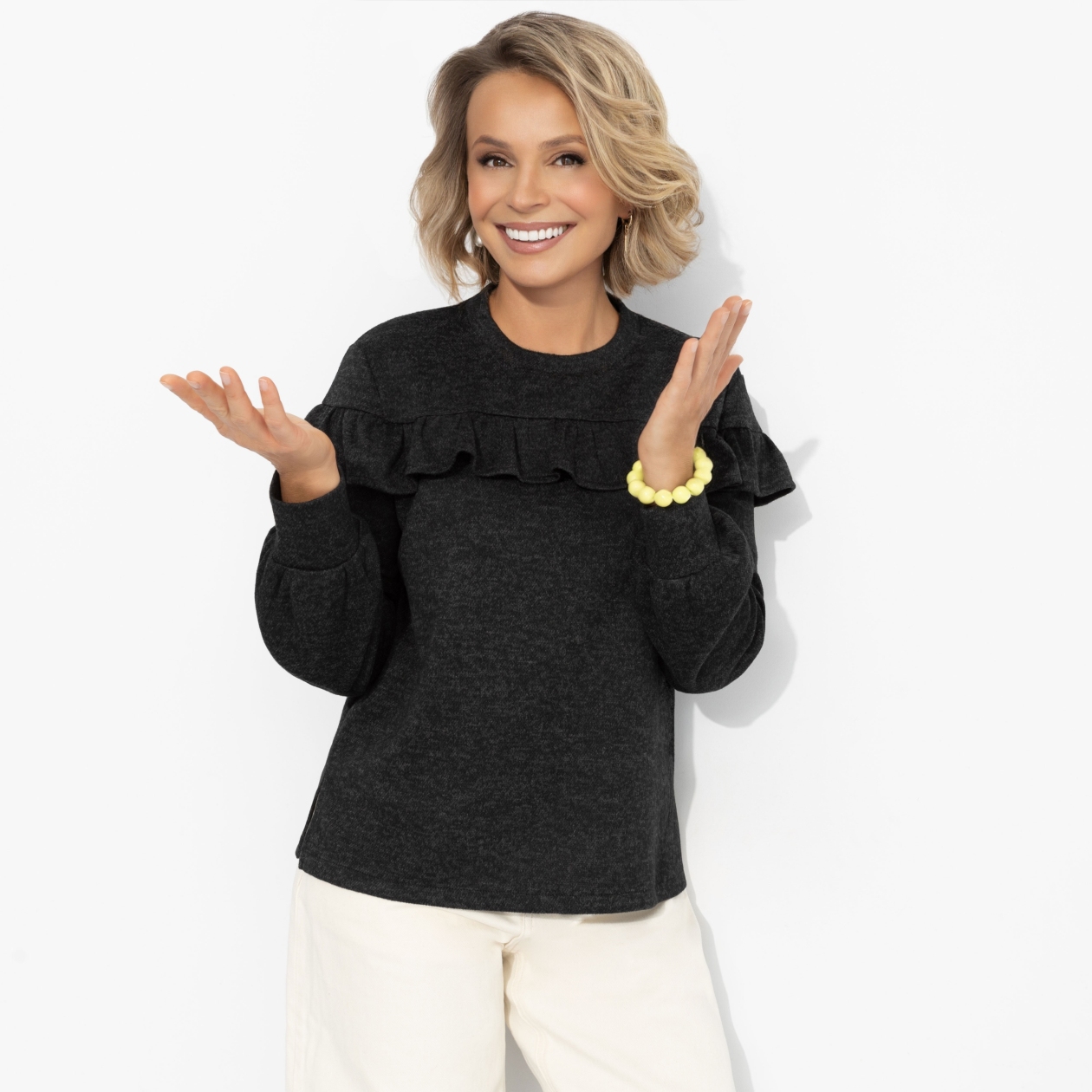 Свитшот для тех, кто ценит баланс между женственностью и практичностью. Энергичные городские минималистки и романтичные особы – каждая найдёт в нём что-то своё. Добавьте графитовый шарм в привычный образ! Прямой крой и эффектная рюша на плечах – идеальный микс для стильных будней. Свитшот подходит как светлым, так и тёмным цветотипам, эффектно смотрится на разных фигурах, легко комбинируется с джинсами или классическими брюками.