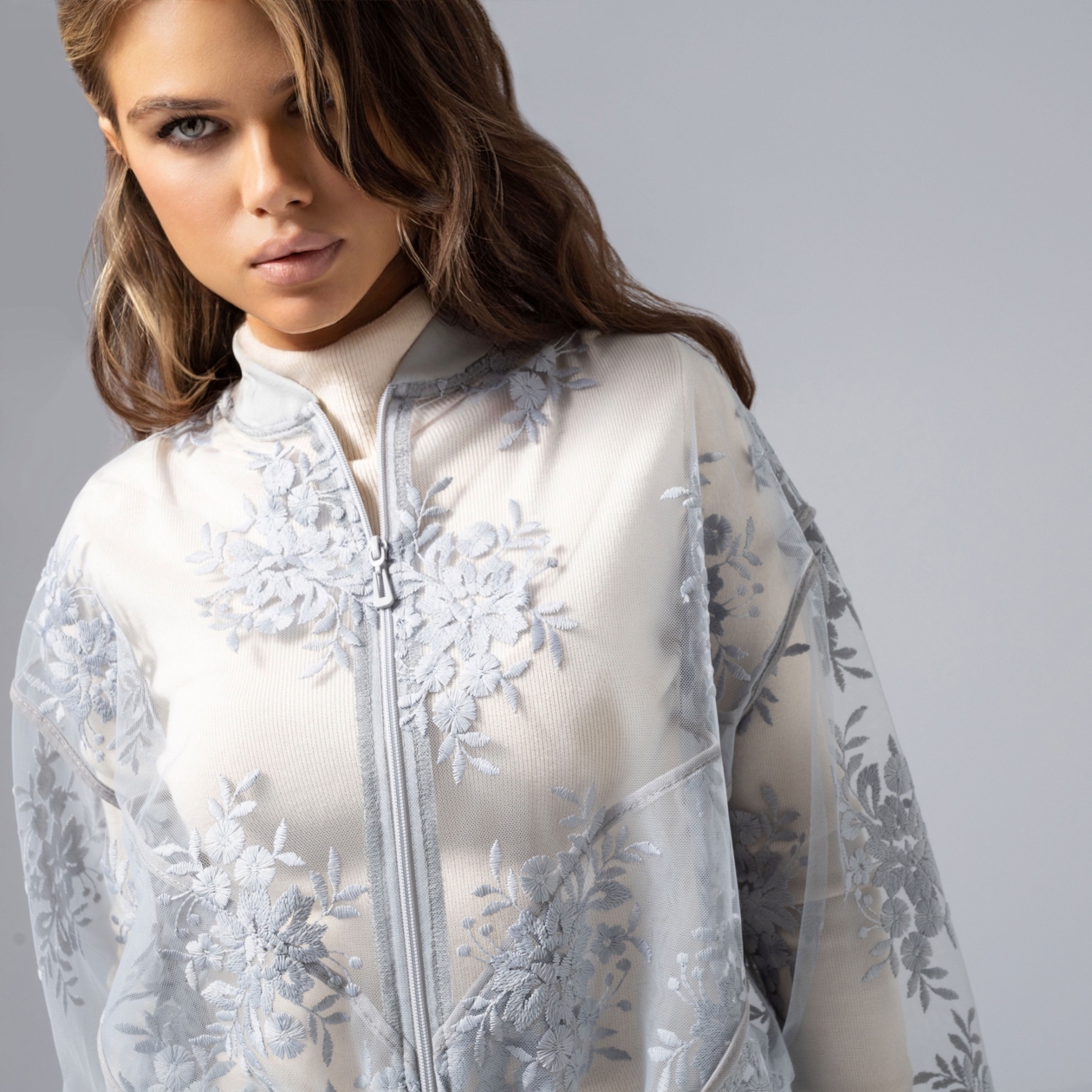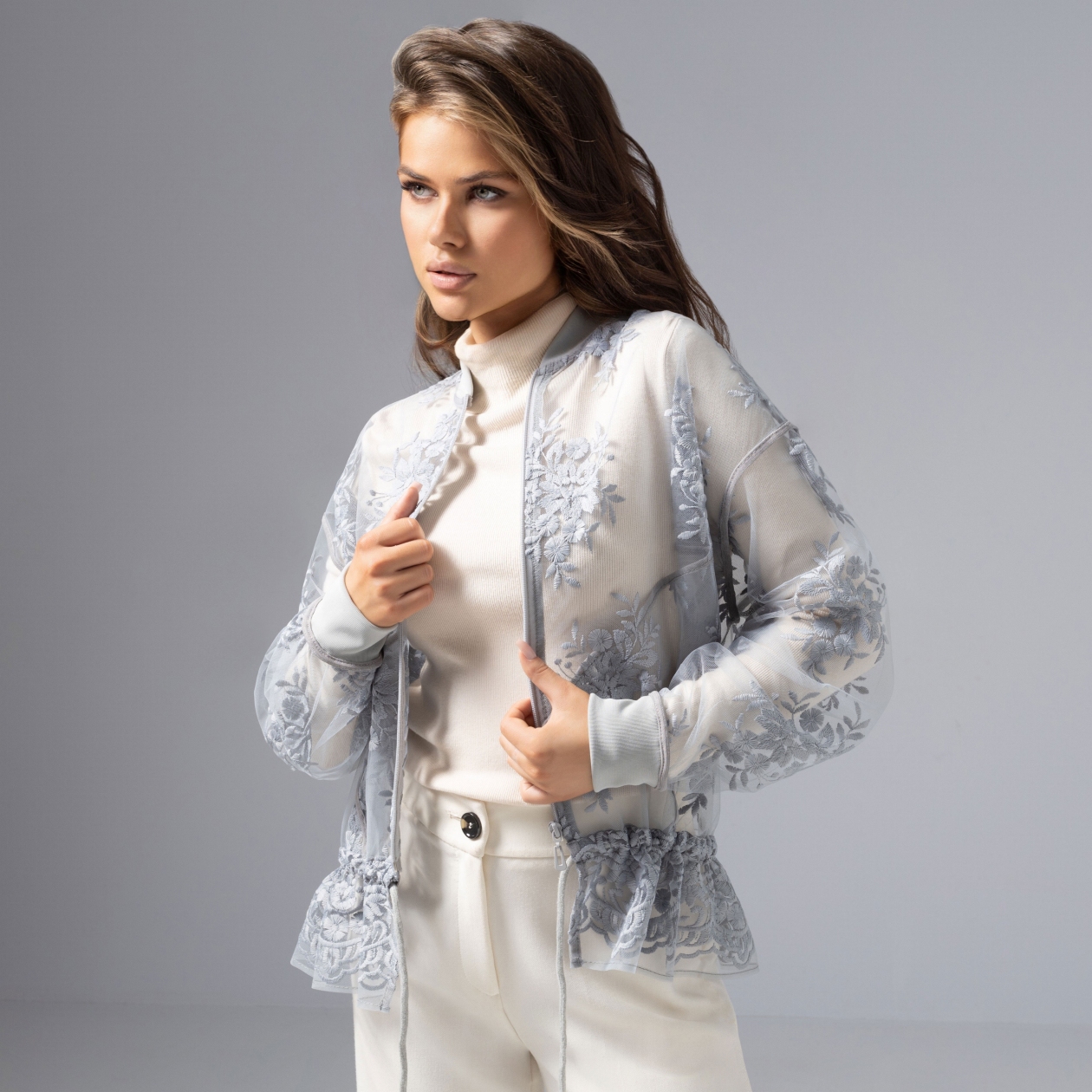 Однажды она надевет бомбер и выходит на балкон с видом на вечерний город – легкий трепет кружева на ветру, серебряные огни подчеркивают каждый изгиб ткани. Слишком изысканно для правил, слишком ярко для повседневности – сегодня вы в центре самого модного сюжета. Филигранная вышивка, мягкие манжеты и регулируемая кулиска – этот бомбер для тех, кто любит создавать истории и быть вдохновением для окружающих. Изделие с карманами.