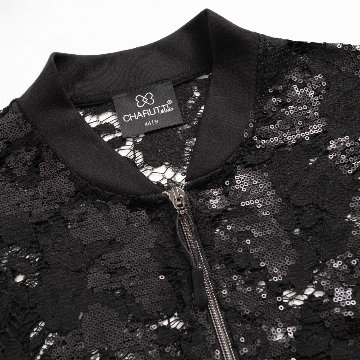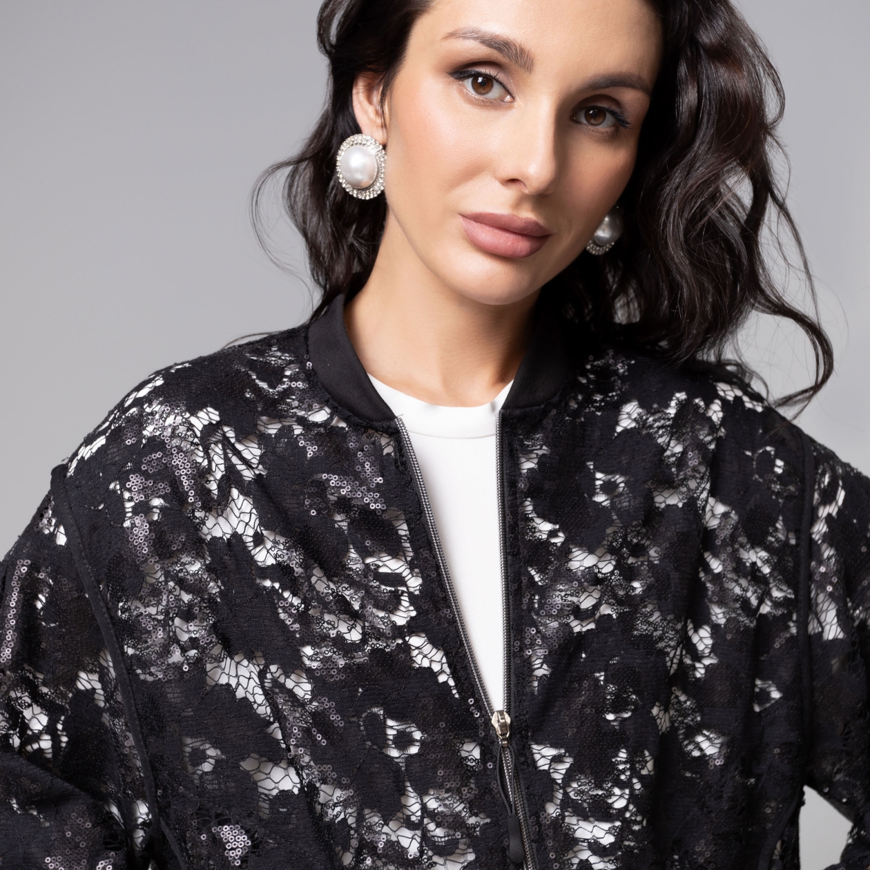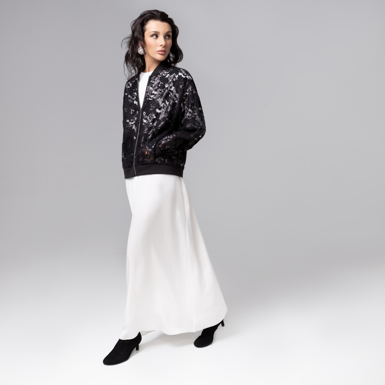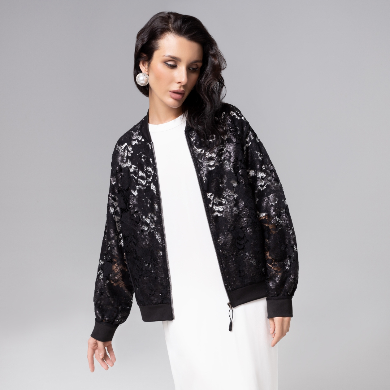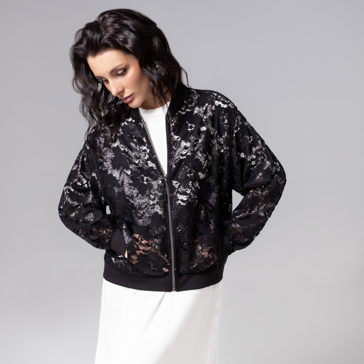 Ажурное кружево и мерцание пайеток превращают бомбер в откровение. Он шепчет о тайных встречах и ярких эмоциях, оставляя после вас лёгкий след блеска и мечтаний. Безупречный пошив демонстрирует ювелирная аккуратность обработки швов, а продуманный крой гарантируюет безупречную посадку по фигуре. Бомбер с карманами.