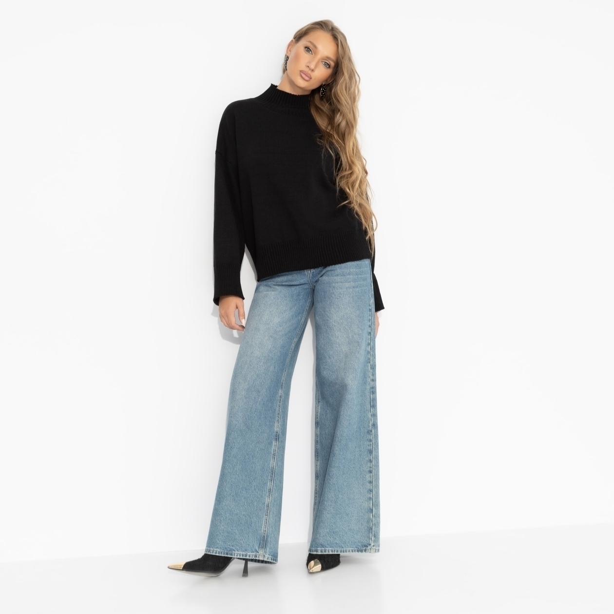 Базовый чёрный – когда ты создешь стиль без усилий. Уютная вязка и мягкая шерсть для максимального комфорта в образе на каждый день. Простая форма + мощная энергия – идеальное комбо. Джемпер с высоким воротником из вязаного трикотажа с добавлением шерстяной нити.