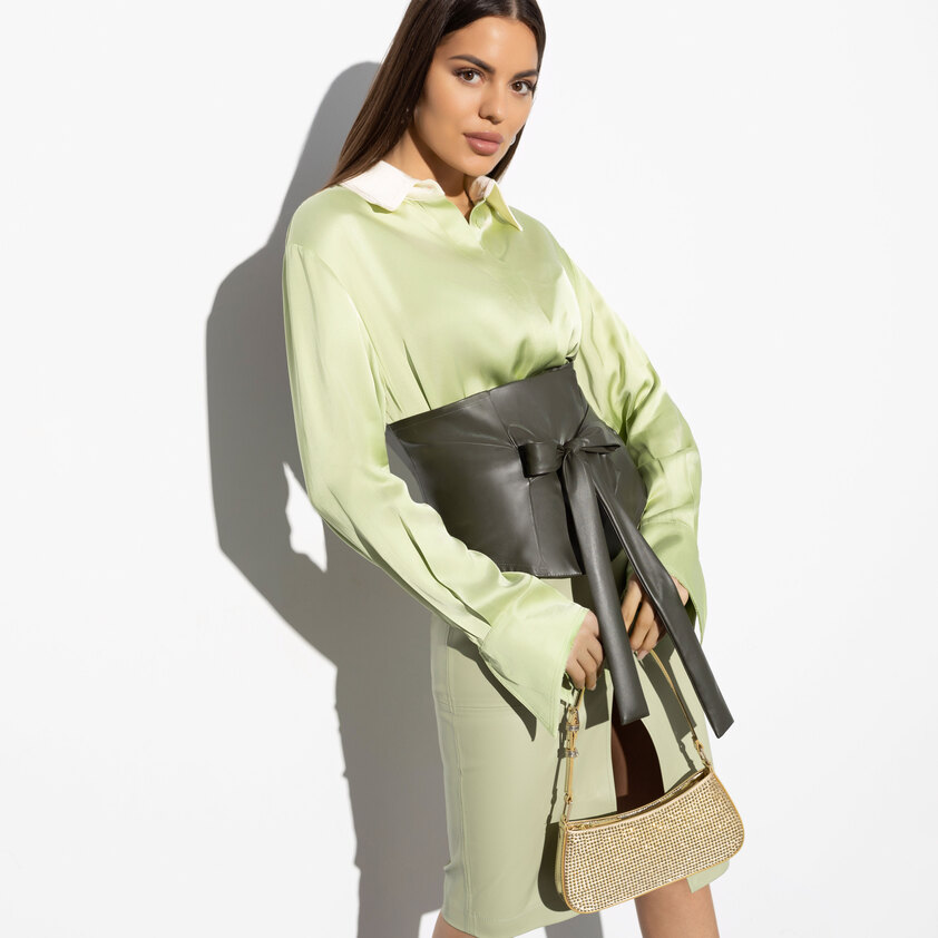 Красоту оттенков дополняет характерный блеск экокожи, придавая образу особую сияющую утонченность.