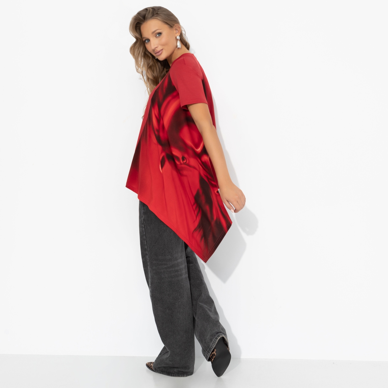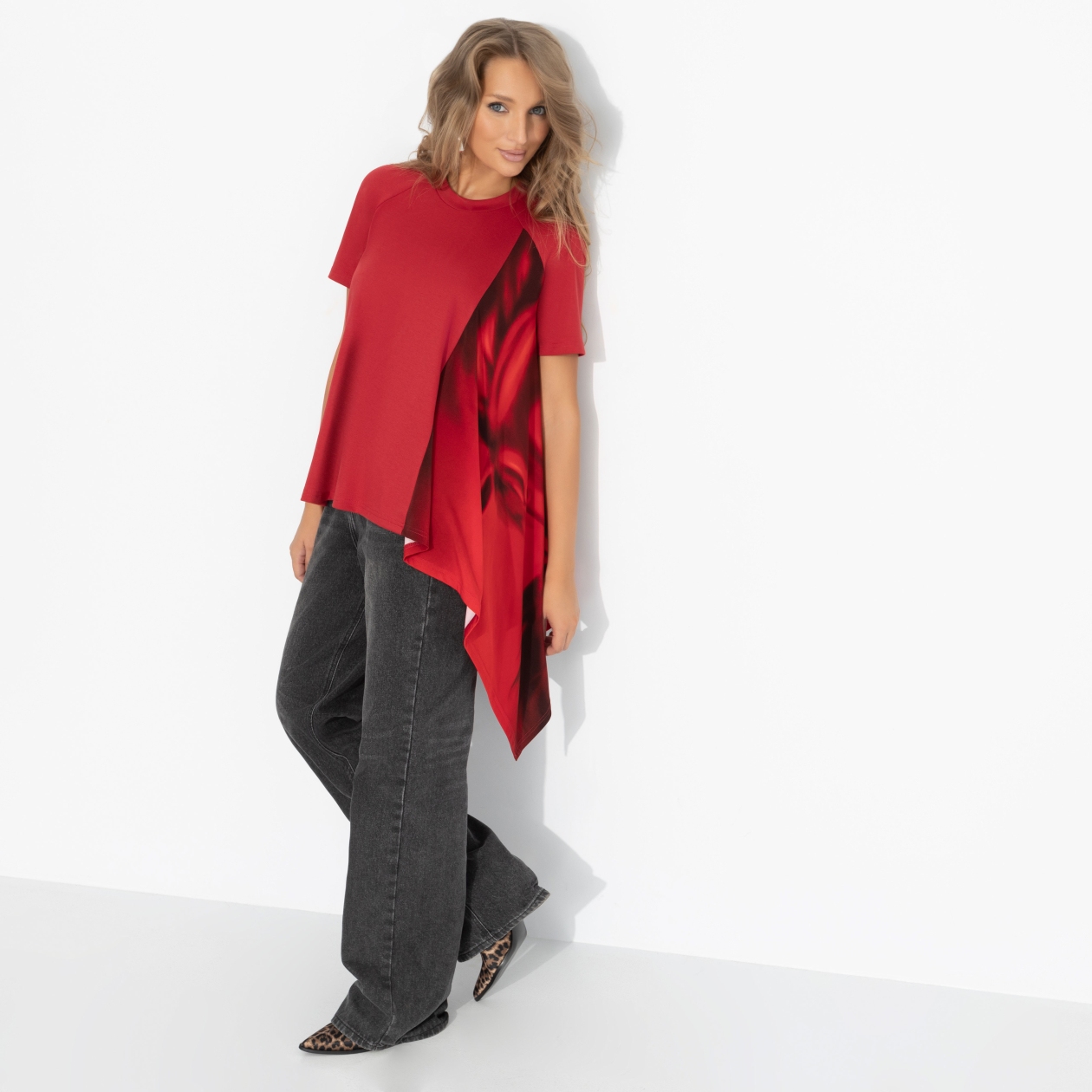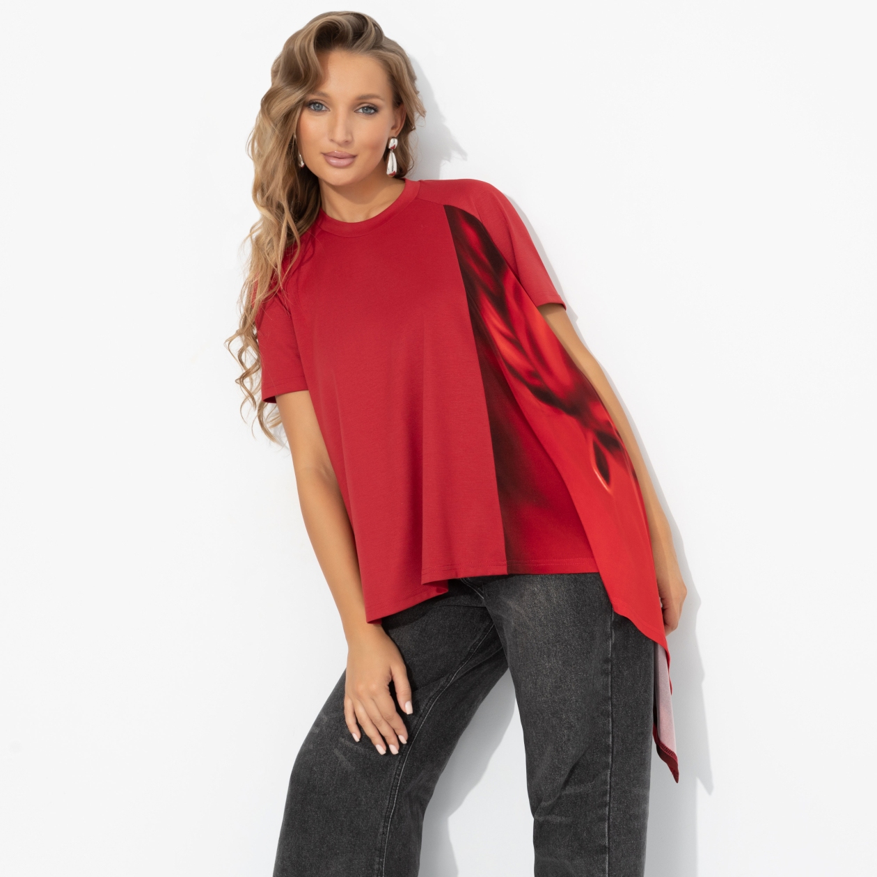 Когда другие делают ставку на классику – вы делаете ход конём. Блуза «Я здесь главная» – красный, асимметрия и энергия победы. Асимметричная футболка свободного кроя из мягкого трикотажа с лёгкой драпировкой сбоку. Контрастная вставка с арт-принтом создаёт динамику и стройнит силуэт. Не мнётся. Подойдёт самым смелым.