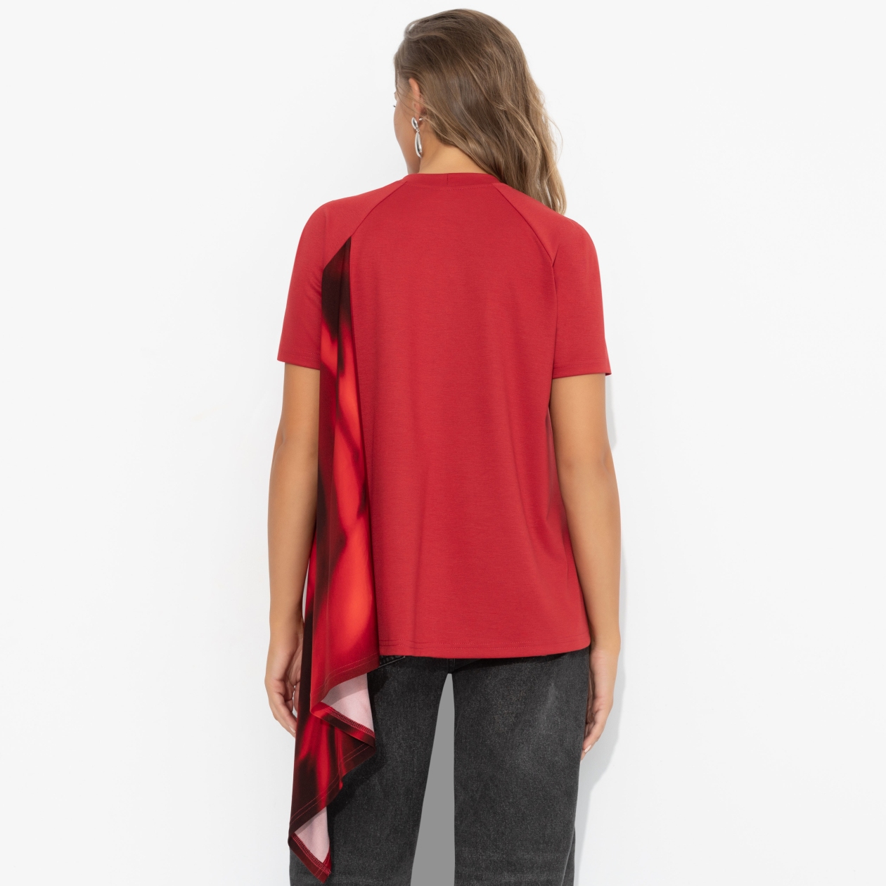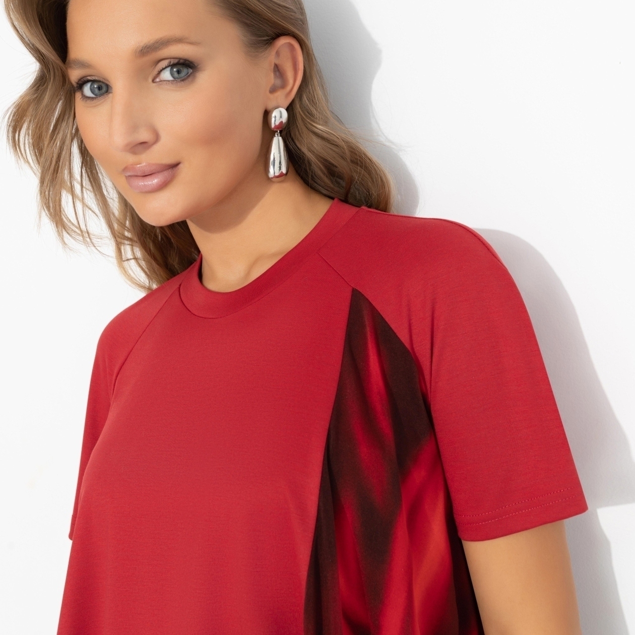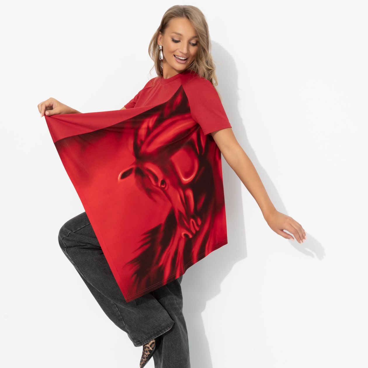 Когда другие делают ставку на классику – вы делаете ход конём. Блуза «Я здесь главная» – красный, асимметрия и энергия победы. Асимметричная футболка свободного кроя из мягкого трикотажа с лёгкой драпировкой сбоку. Контрастная вставка с арт-принтом создаёт динамику и стройнит силуэт. Не мнётся. Подойдёт самым смелым.