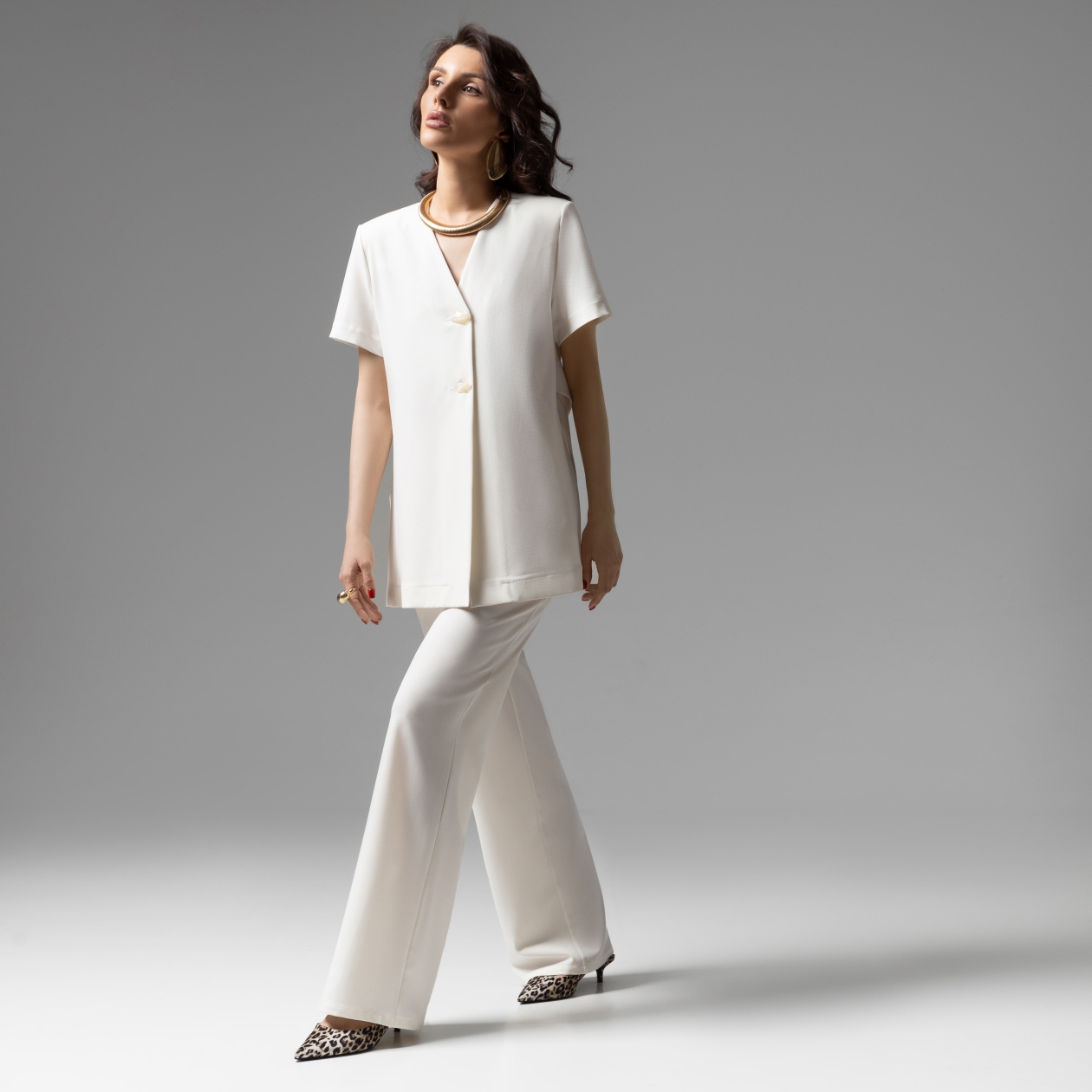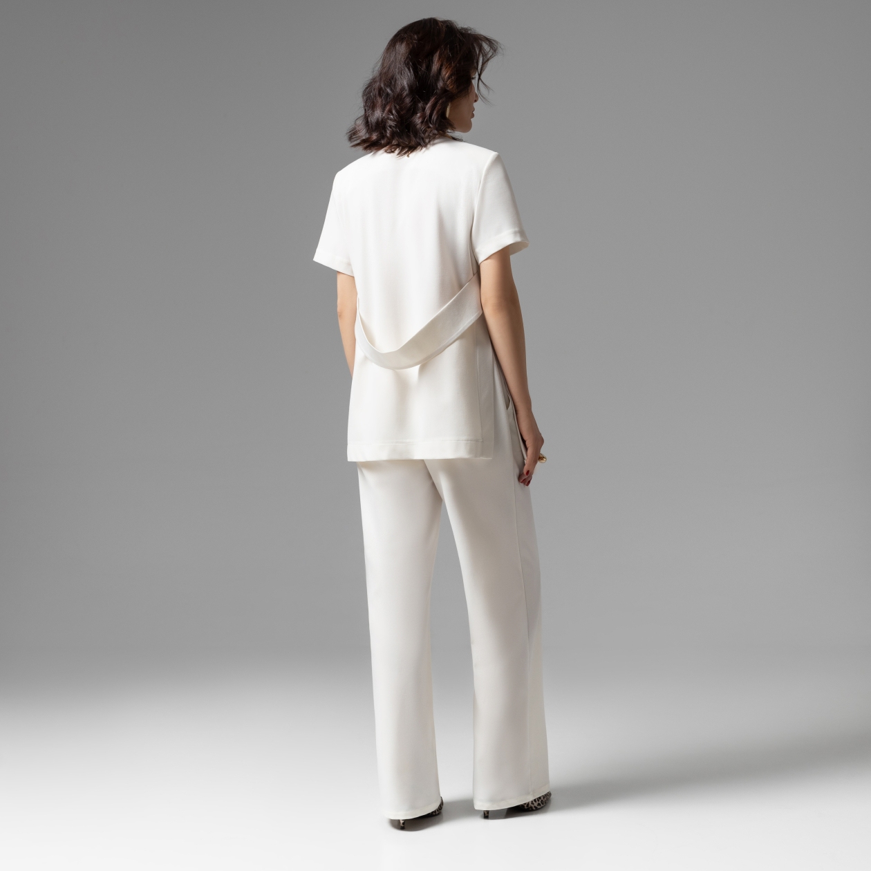 Олицетворение утонченности стиля old money. Изготовлен из высококачественной костюмной ткани по тщательно выверенным лекалам. Безупречная посадка дополнена акцентной фурнитурой. Костюмный ансамбль гарантирует комфорт движений. Используйте детали в виде шелкового платка или длинных бус, чтобы дополнить образ. Комплект состоит из блузы прямого кроя с коротким рукавом и широких прямых брюк. Акцентная деталь по спинке в виде вшитого пояса. Есть разрезы по боковым сторонам изделия. Высокая посадка брюк на талии на резинке. Брюки с карманами.
