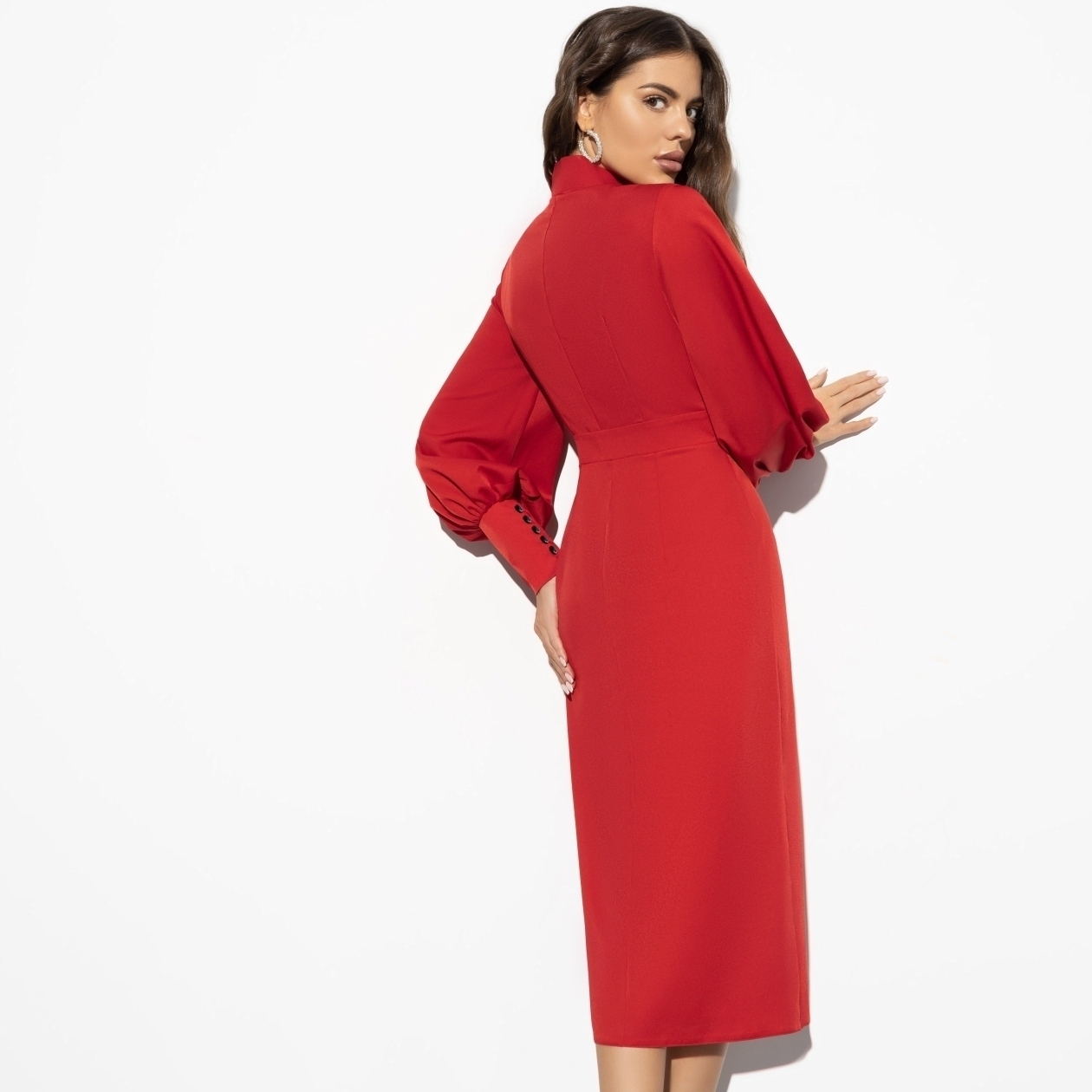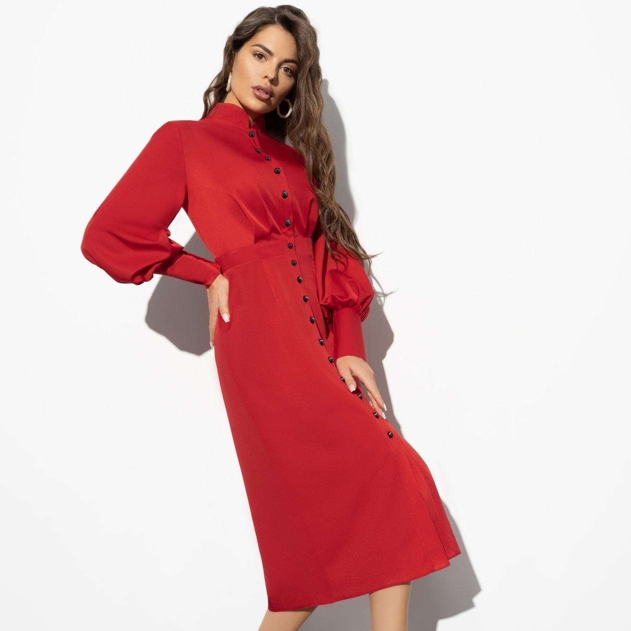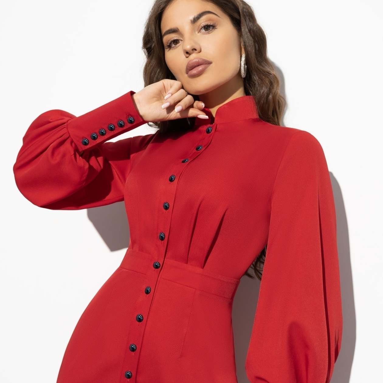 В этом платье внимание становится фоном. Красный цвет усиливает присутствие, линии подчёркивают уверенность, а соблазн здесь – естественный, как дыхание. Просто появиться – уже достаточно. Платье силуэтное с воротником-стойкой и контрастной линией пуговиц. Линия талии завышена.