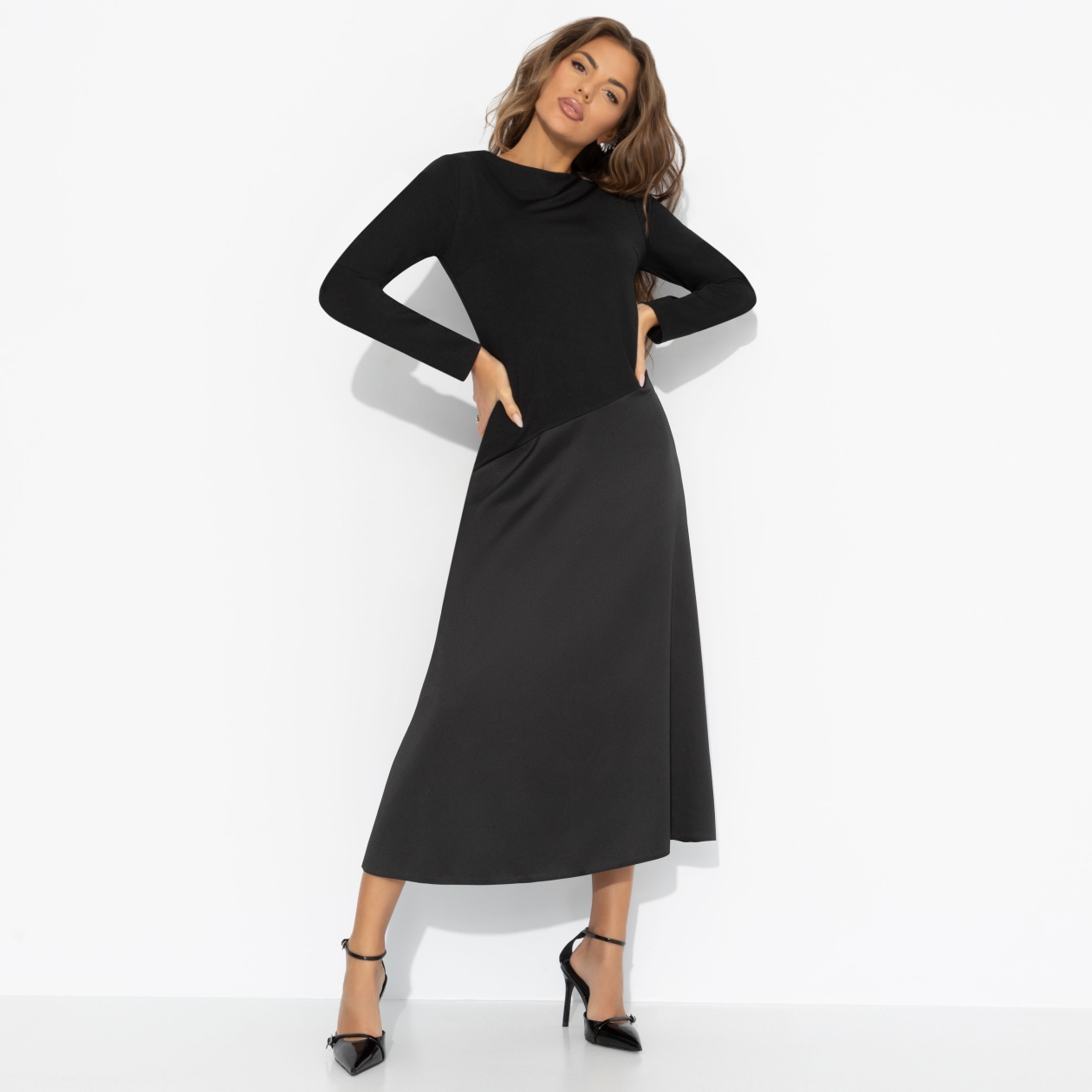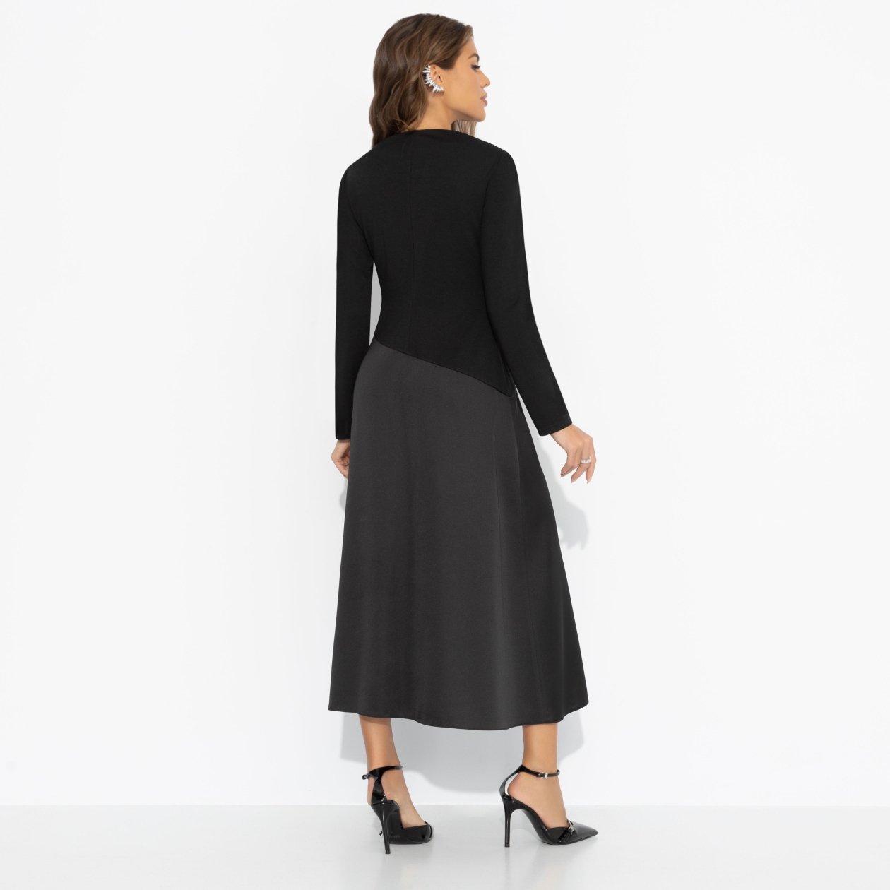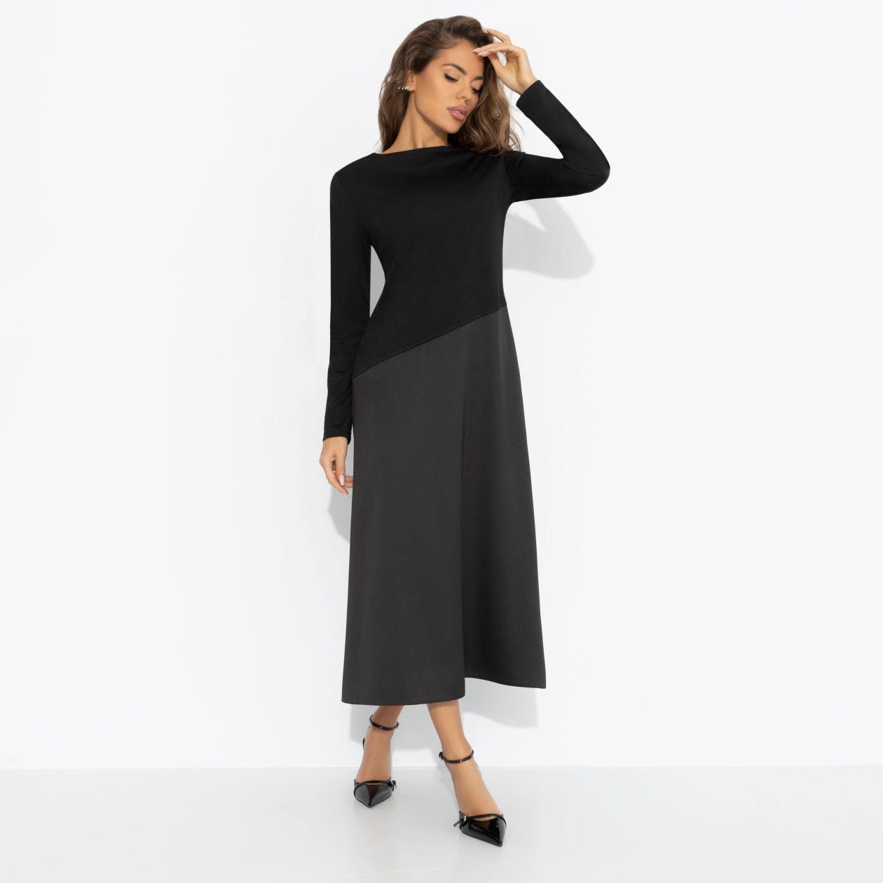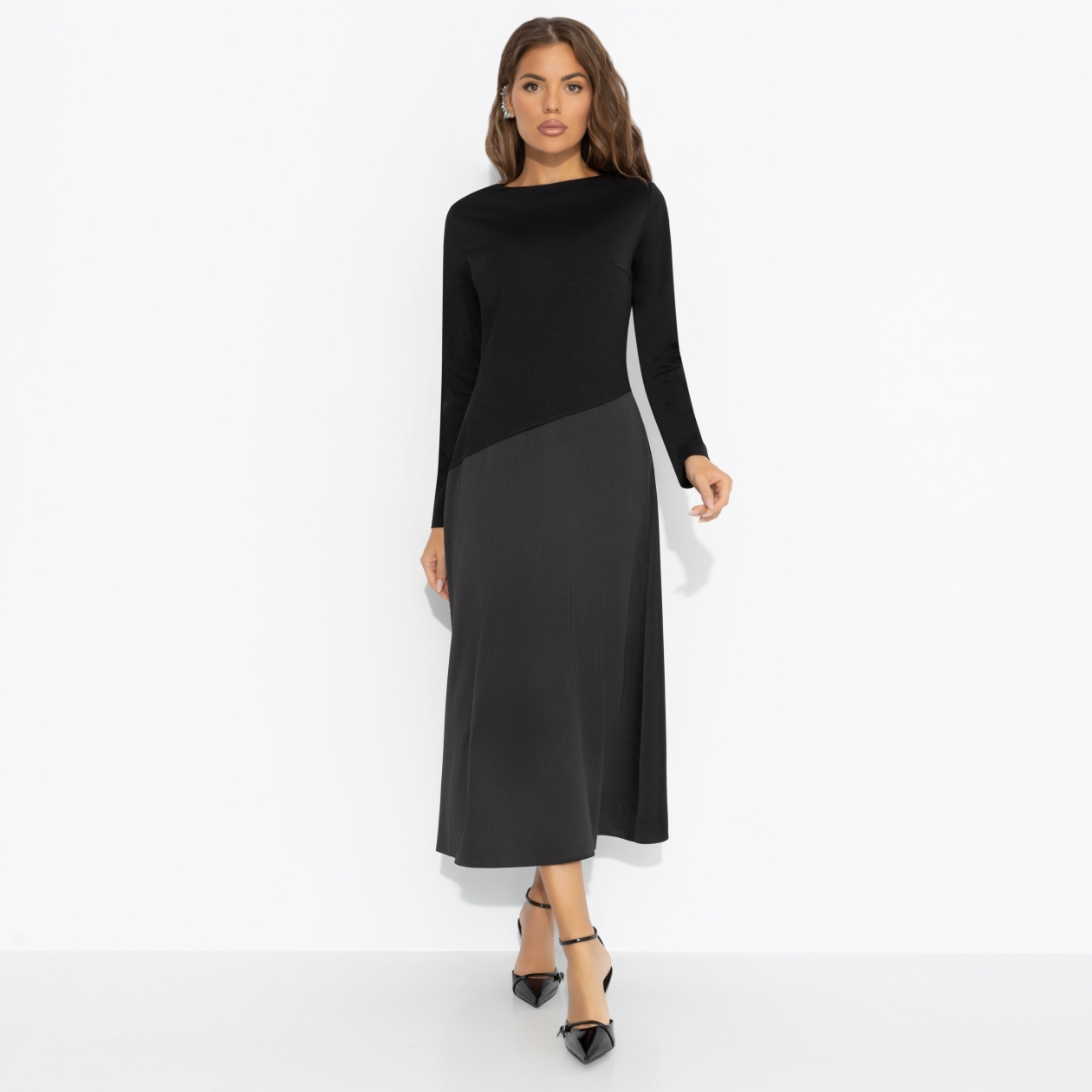Зимой тоже хочется быть женственной ‒ ведь элегантность не знает сезона. Чёрный верх и плавный переход к глубокому графитому низу делают базовый образ загадочным, а идеальный крой стройнит без лишних усилий. Почувствуй себя героиней городской зимы. Платье миди с удобной посадкой. Скошенная линия по талии скульптурирует фигуру, а трикотаж «скуба» дарит мягкость, плотность и комфорт.