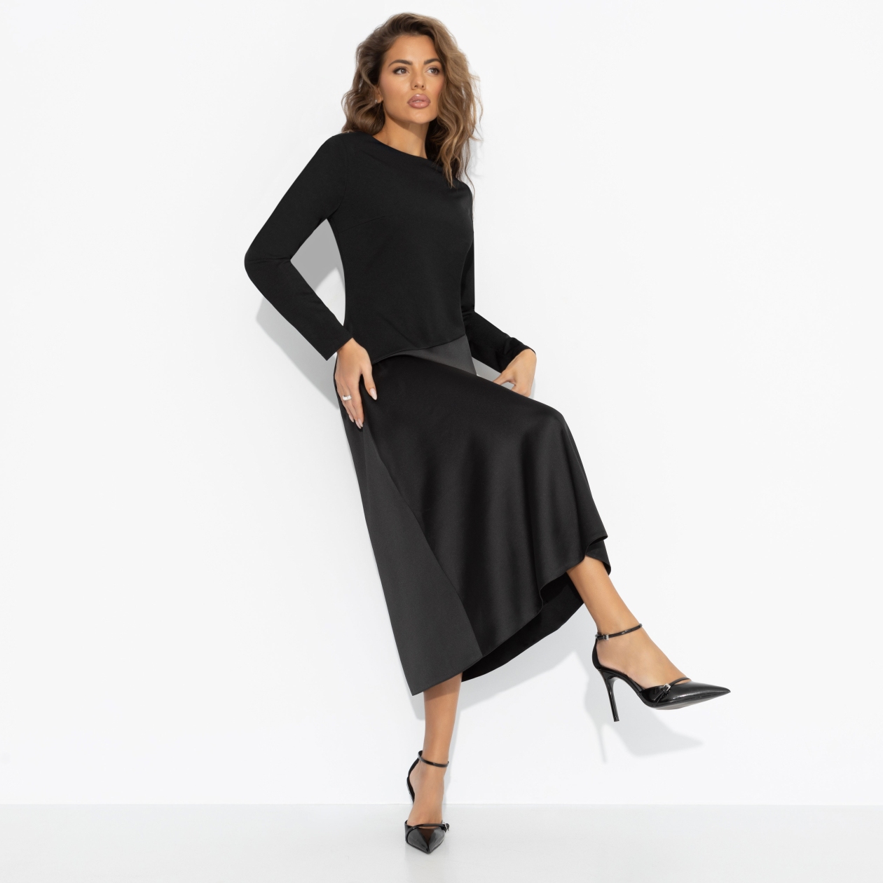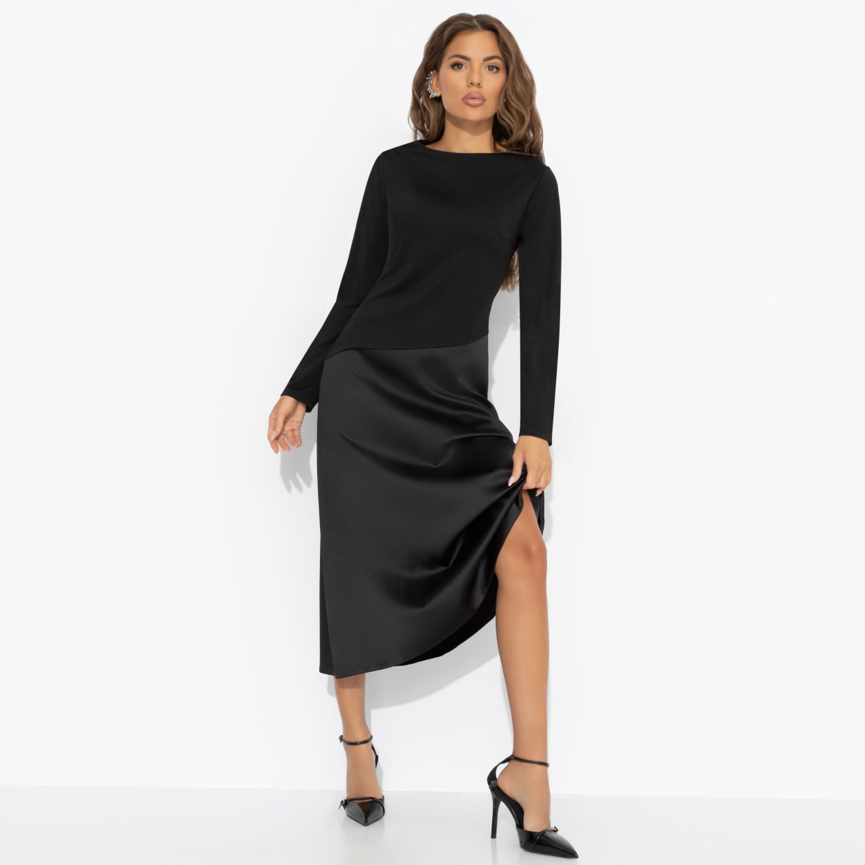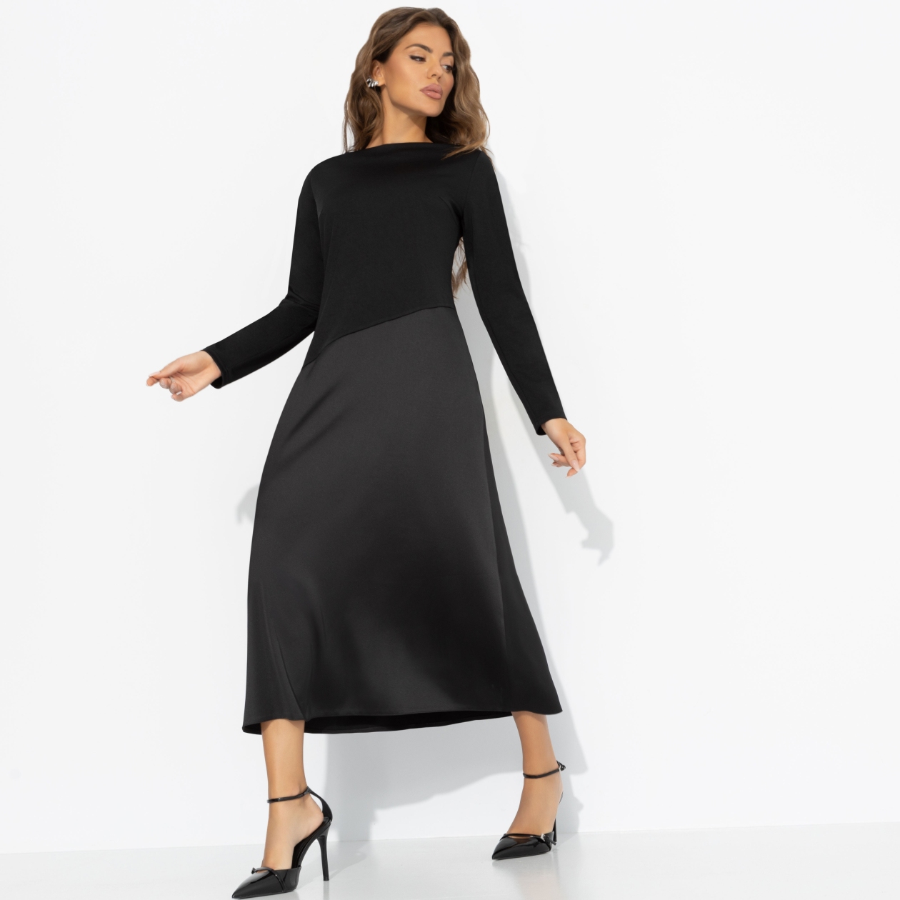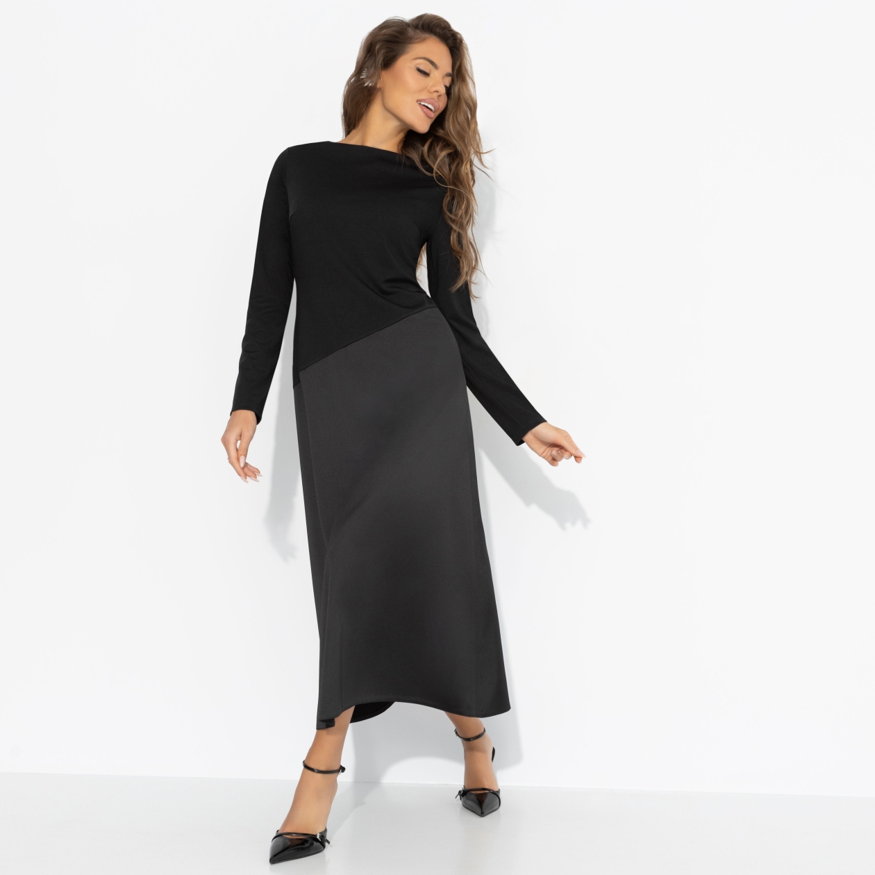 Зимой тоже хочется быть женственной ‒ ведь элегантность не знает сезона. Чёрный верх и плавный переход к глубокому графитому низу делают базовый образ загадочным, а идеальный крой стройнит без лишних усилий. Почувствуй себя героиней городской зимы. Платье миди с удобной посадкой. Скошенная линия по талии скульптурирует фигуру, а трикотаж «скуба» дарит мягкость, плотность и комфорт.
