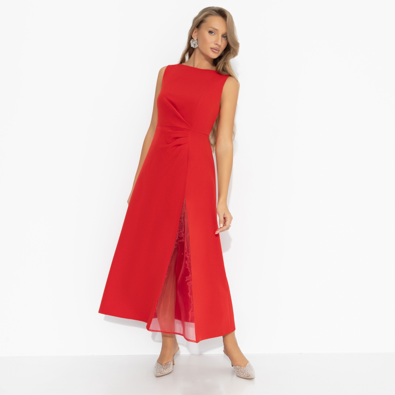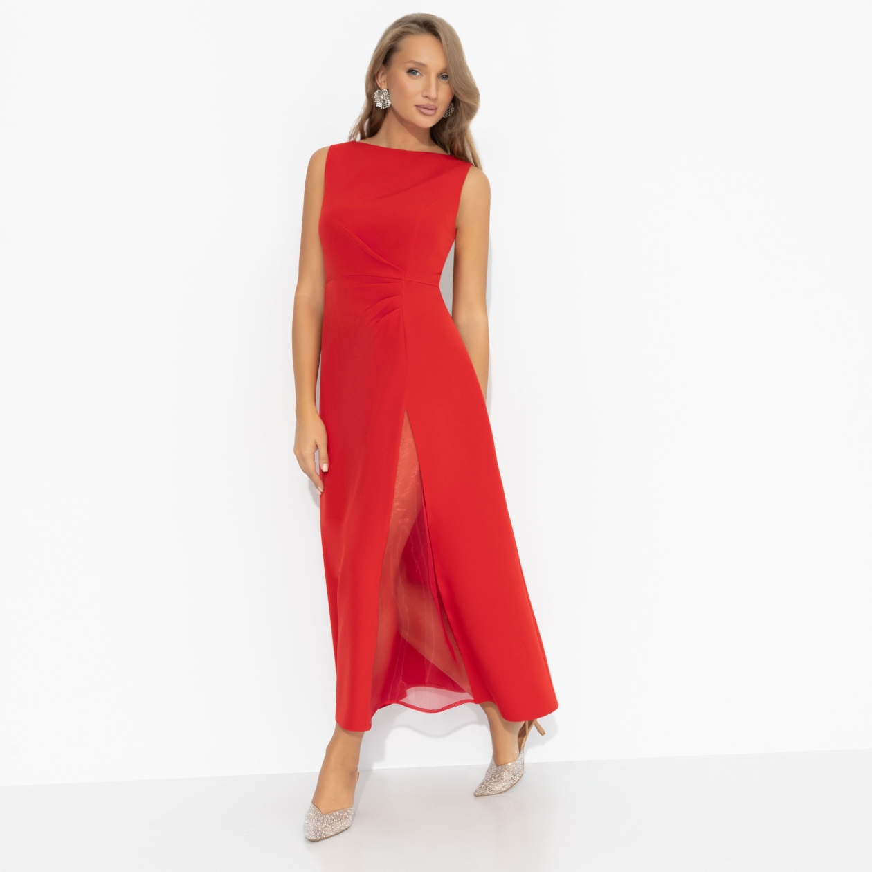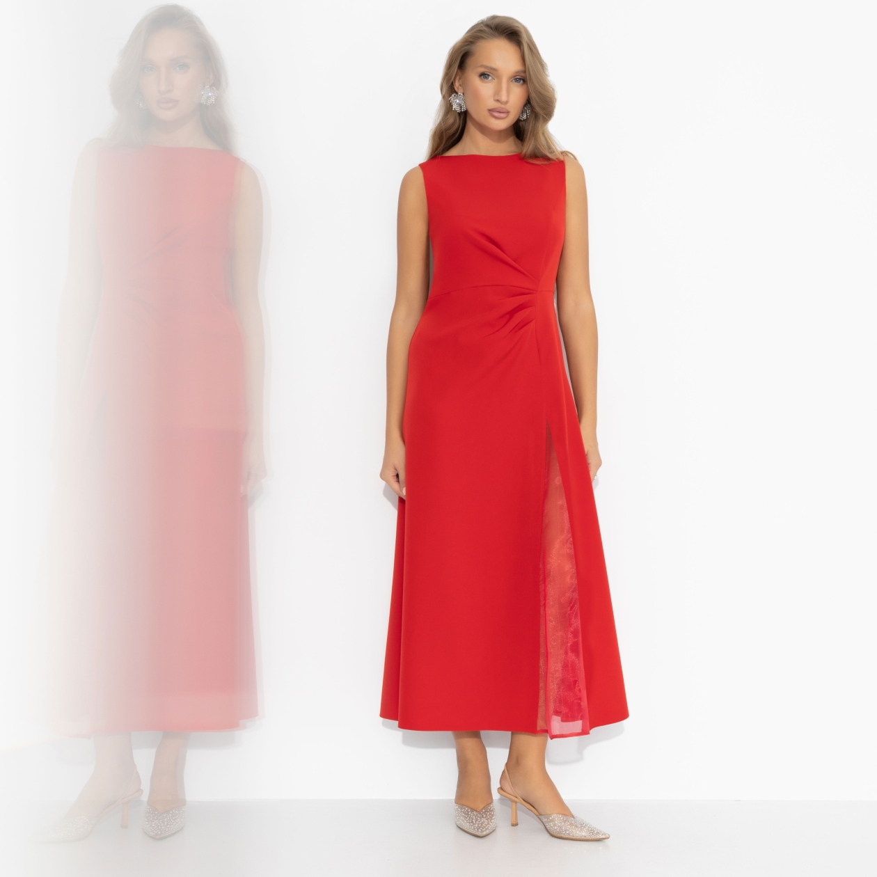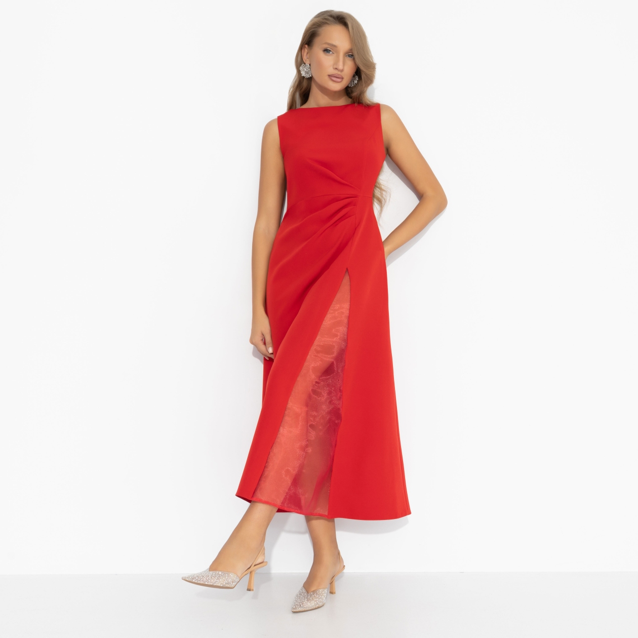 Она знает, чего хочет, и не ищет одобрения. Красный цвет говорит за неё – смело, ярко, без компромиссов. Это платье будто создано, чтобы подчеркнуть уверенность и внутренний огонь. Платье миди из ткани «Барби» с драпировкой на талии и имитацией разреза спереди формирует плавный, женственный силуэт. Без рукавов, с чистыми линиями – идеальный выбор для особых случаев.