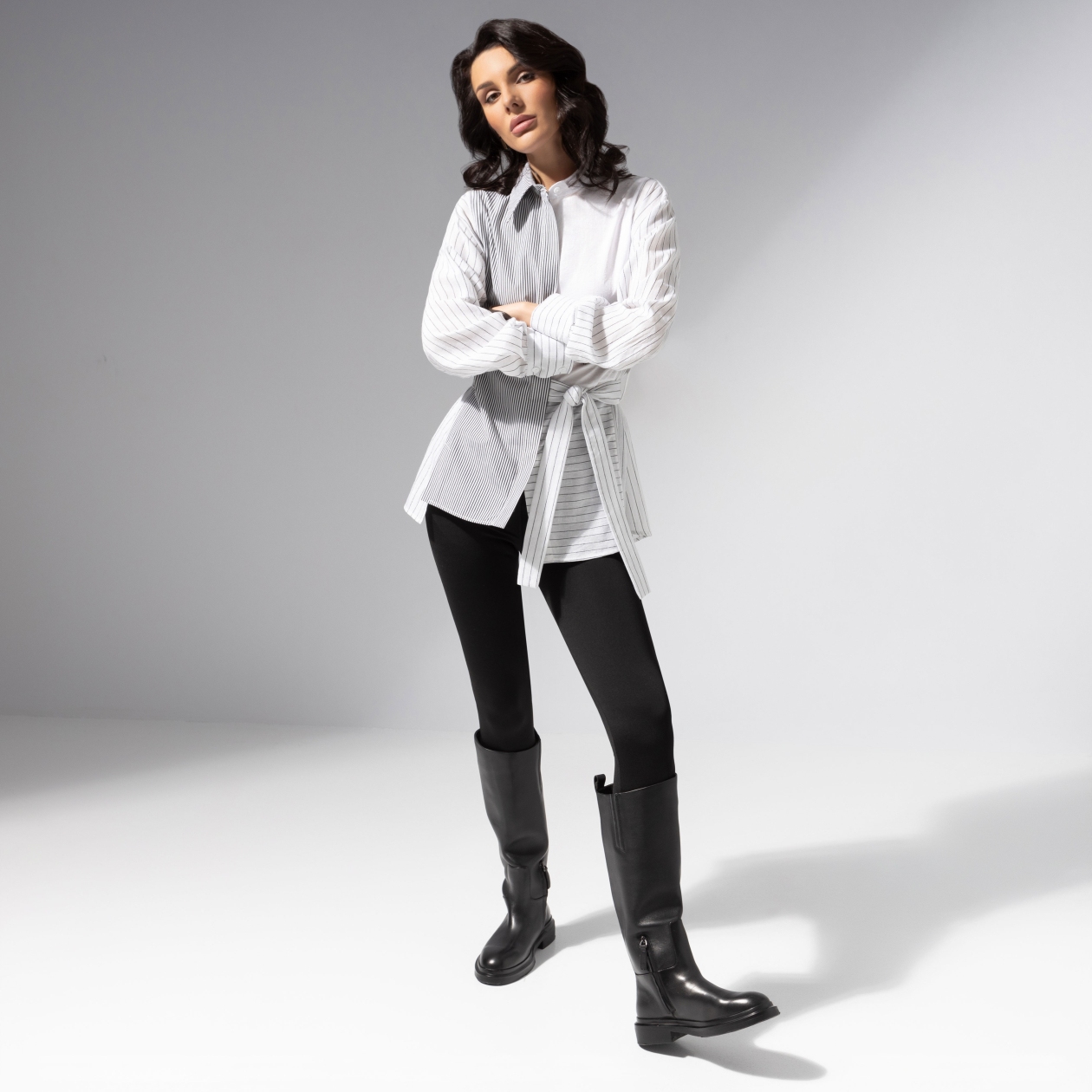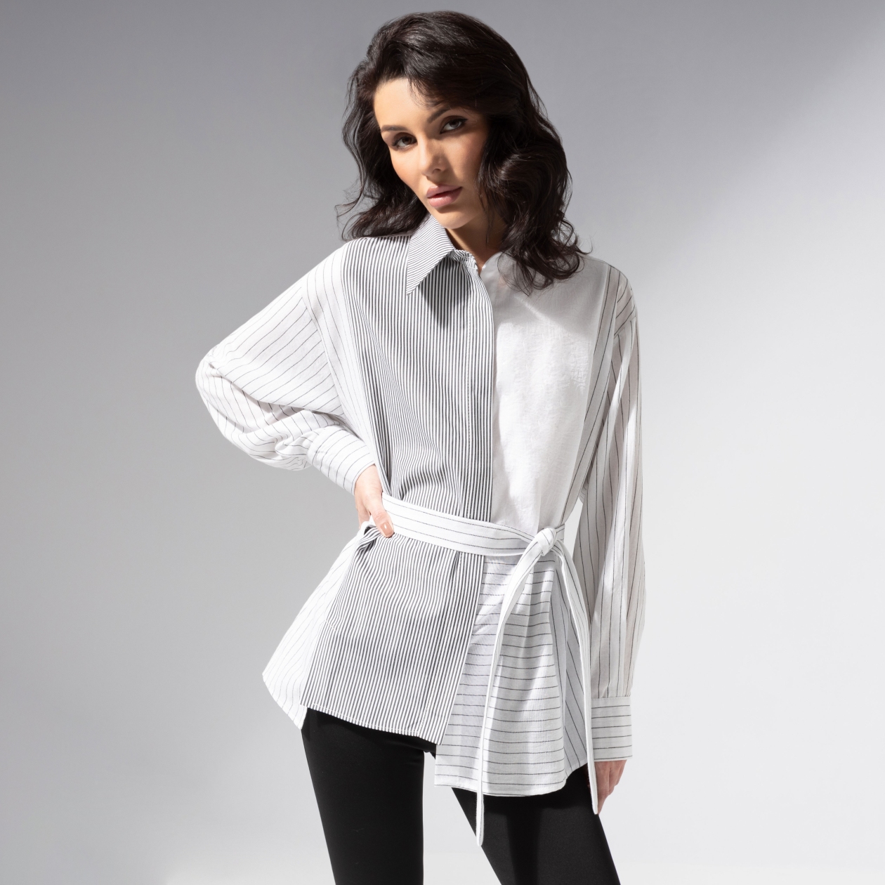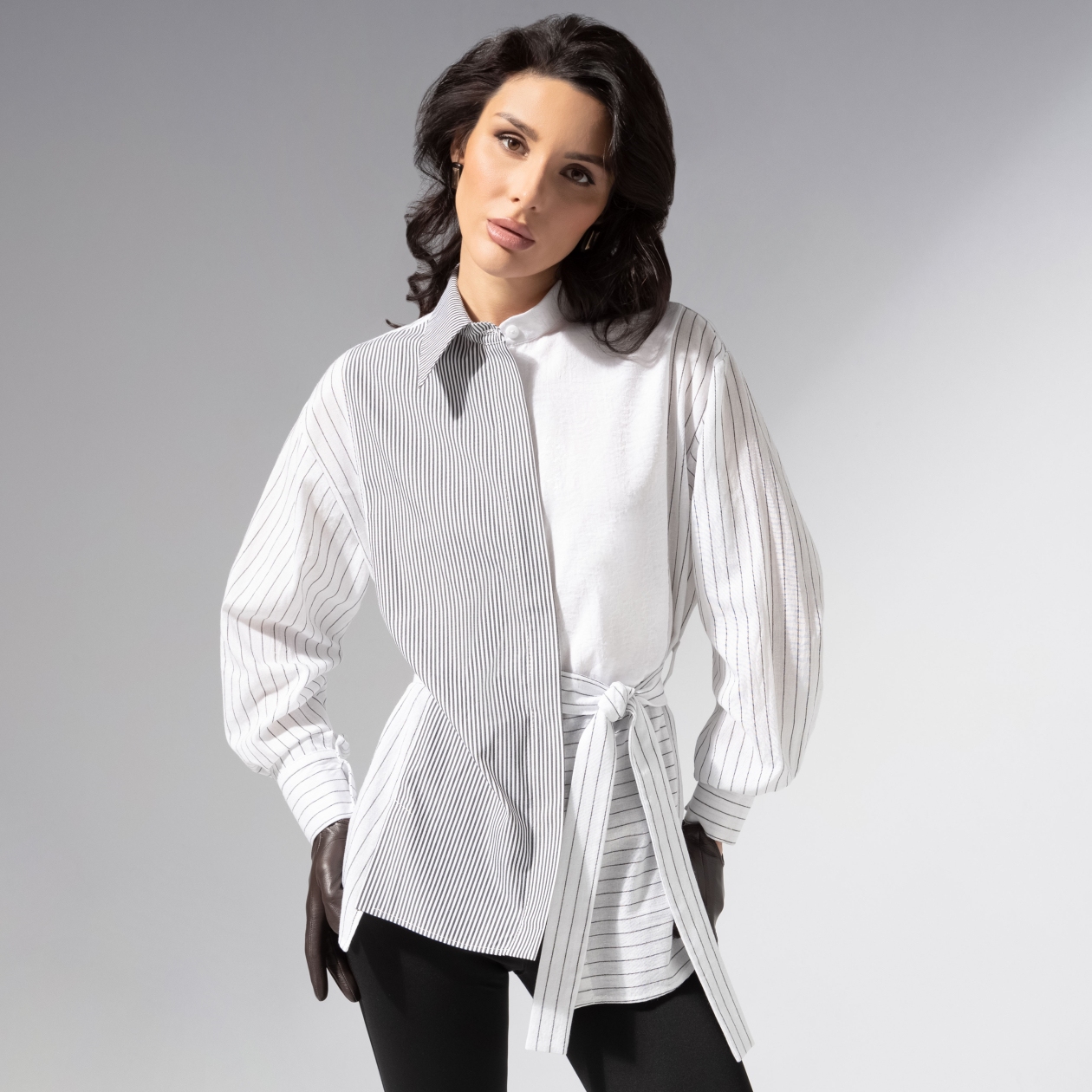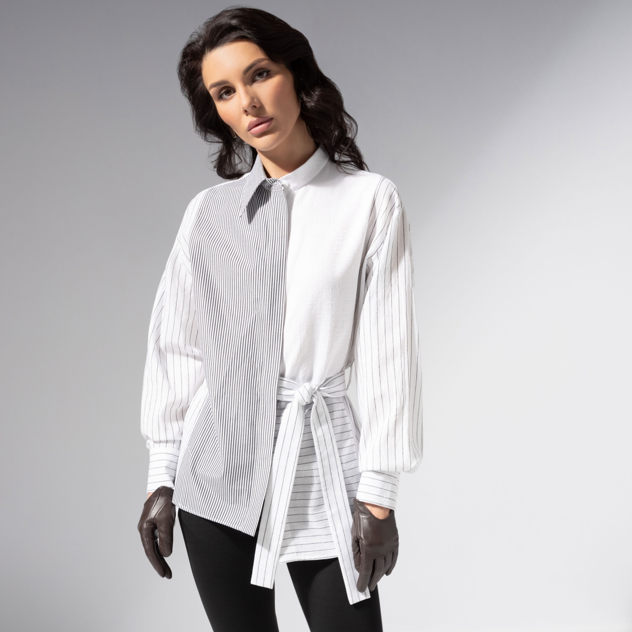 Стиль power dressing в утончённом исполнении. Рубашка ЧАРУТТИ будто соткана из уверенности и лёгкости. Контрастные полоски визуально вытягивают силуэт. Геометрия полос и безупречный крой превращают базовую вещь в модное высказывание. Двухфактурная рубашка с поясом. Свободный крой с акцентом на талию за счёт пояса. Длинный рукав, манжеты на пуговицах.