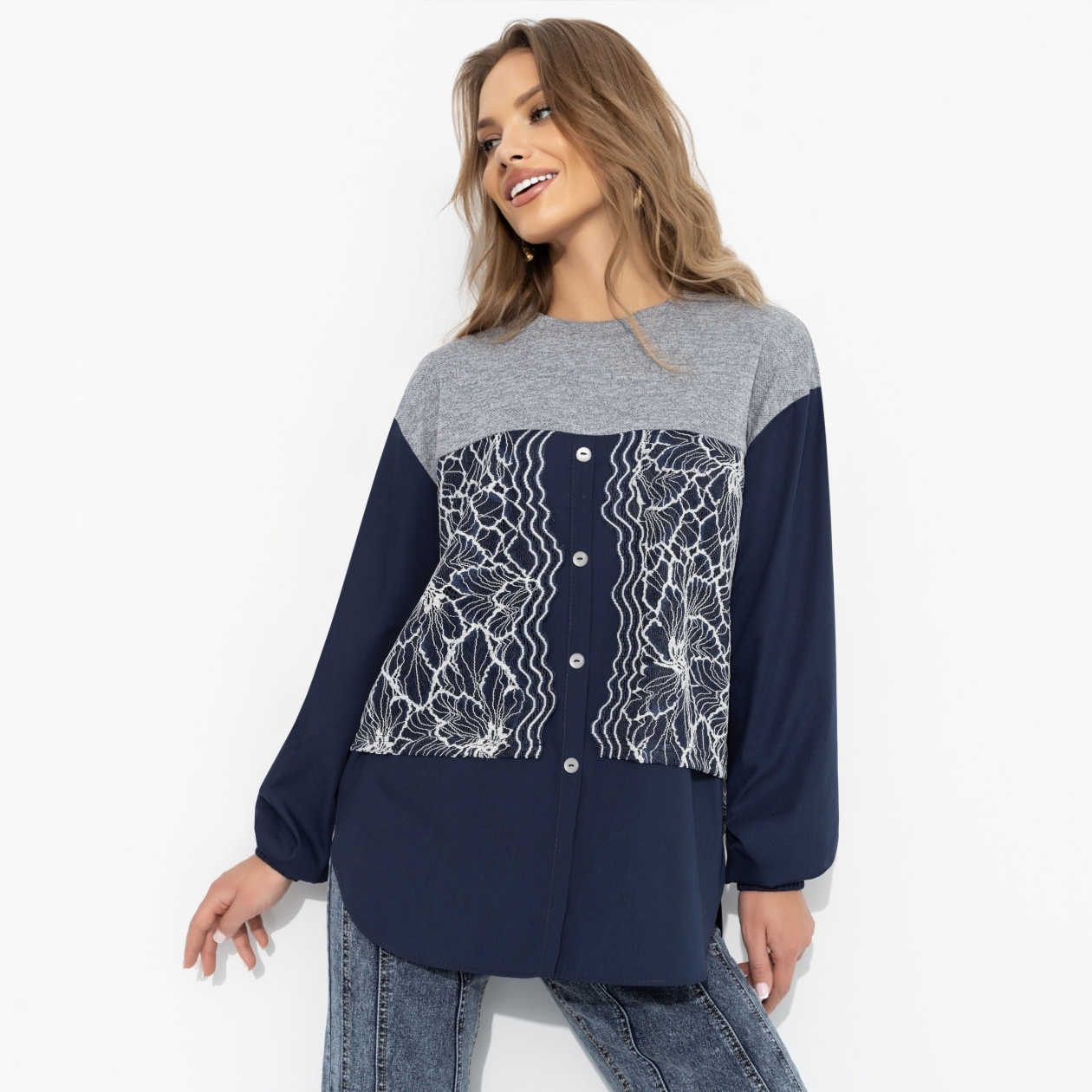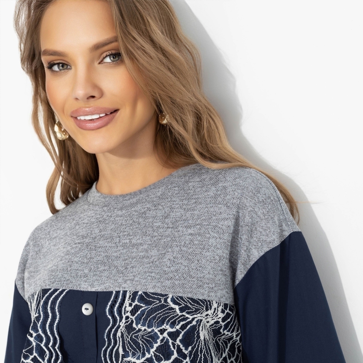 Паутинка кружевных линий будто магически притягивает взгляды к твоему образу. В этом свитшоте ЧАРУТТИ орнаменты завораживают и говорят: у меня есть секрет, но ты не сможешь его разгадать. Свитшот из трикотажа «меланж» декорирован кружевом и поплином. Модель для эффектных будней и особых случаев, когда хочется быть загадочной и чуть-чуть волшебной!
