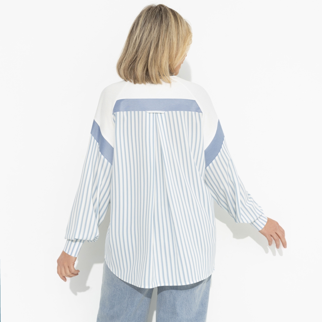 В городе совершенных людей самой совершенной была она. Восходящая звезда дизайна интерьеров, в окружении только люди высокого ранга. Она всегда выглядела безупречно. На деловой встрече с заказчиками сегодня она сияла в свитшоте CHARUTTI в нежных оттенках. Свитшот комбинированный, свободного кроя. Декорирован пуговицами. Спущена линия рукава. Изделие хорошо смотрится в заправленном виде и навыпуск.