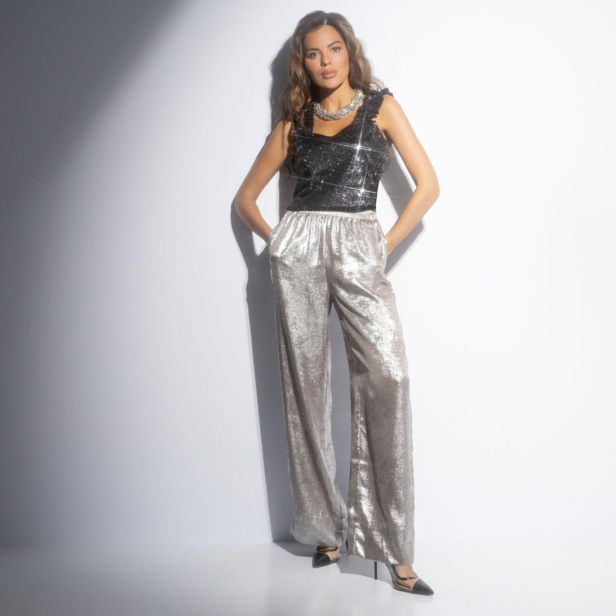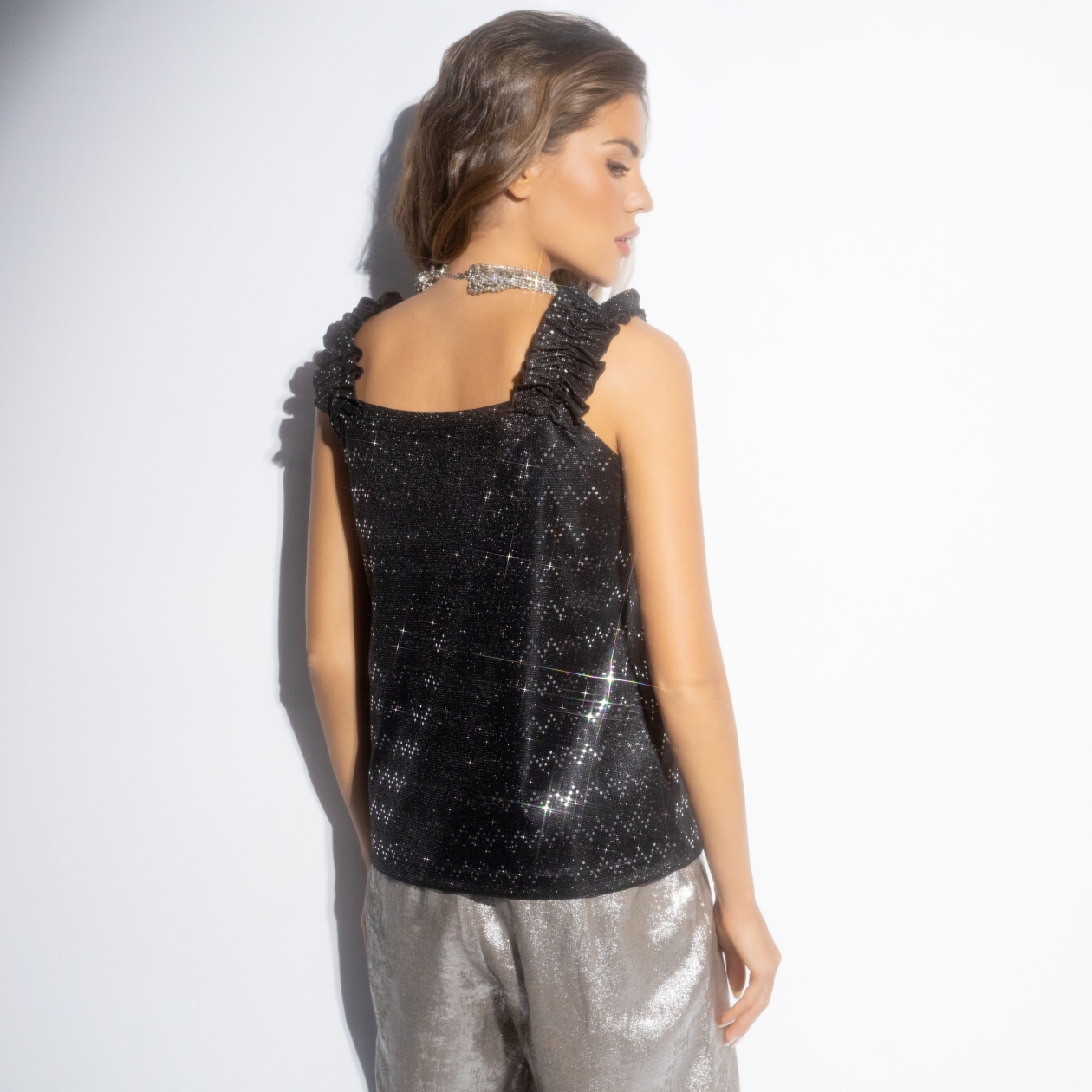 Новый год, шампанское, бой курантов, свет гирлянд... И ты – как современная героиня романтического фильма: дерзкая, сияющая, опасно притягательная. Черный мерцающий топ пикантно подчеркивает линию плеч, ловит каждый луч света и превращает любую вечеринку в ваш сольный выход на красной дорожке. Фигурный вырез и мягкие оборки по бретелям создают женственный силуэт. Топ – прекрасное дополнение образа для моментов, когда раздаётся звон бокалов.