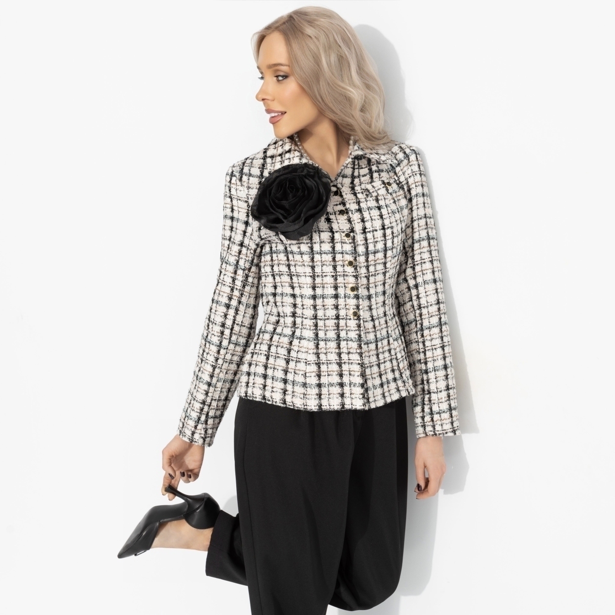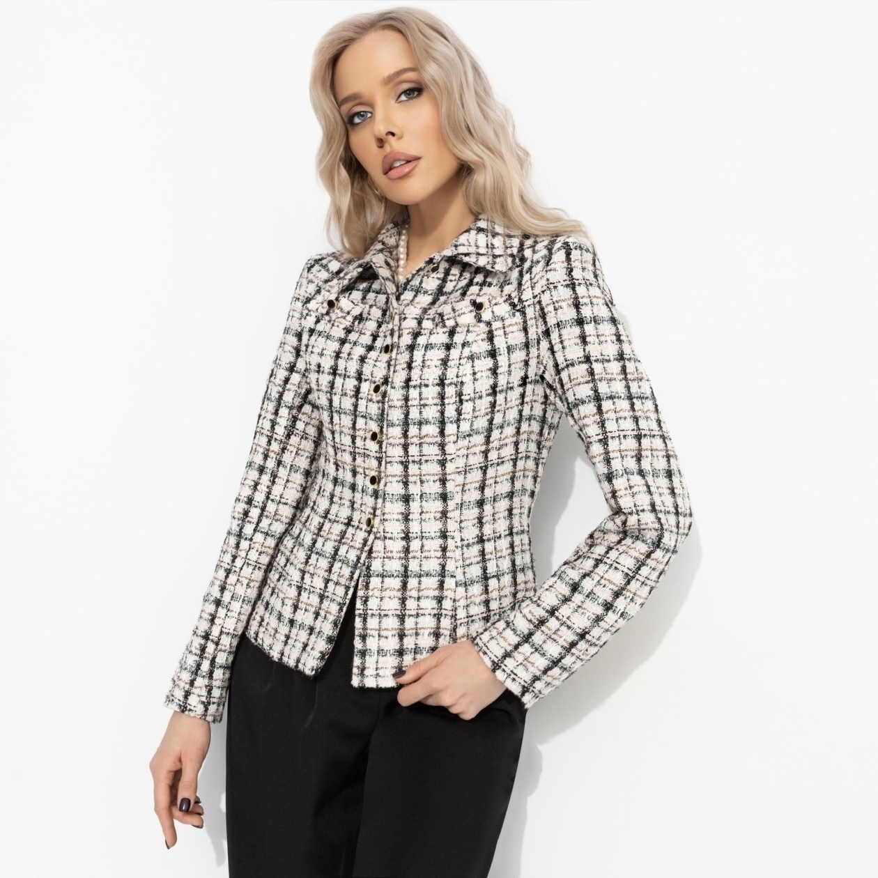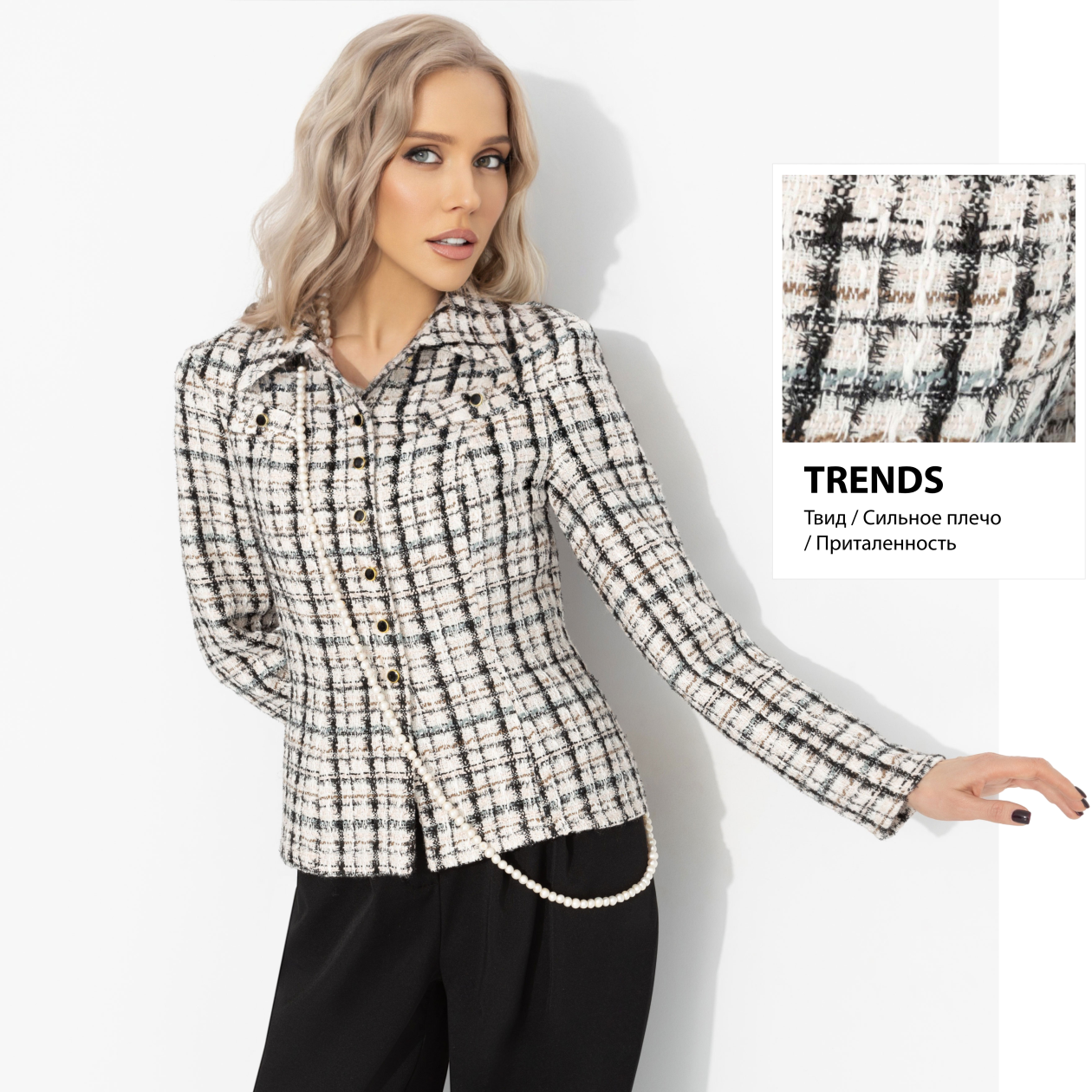Жакет из твида «Шанель» с богатой цветовой палитрой от карамельно-розовых оттенков до черно-белых выглядит как уверенный ответ миру: женственно, но с характером. Глянцевые пуговицы в золотой огранке работают как точка в конце фразы – чётко и дорого. Натуральный состав (65% вискозы). Этот жакет решительный лидер в трендах сезона: твид, подчёркнутая талия и уверенное плечо. «Искра решимости» – когда вы не ждете одобрения. Вы его создаёте.