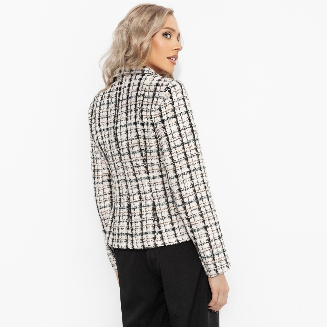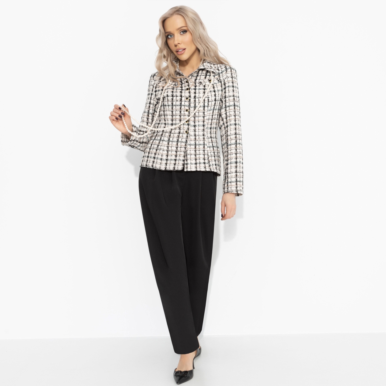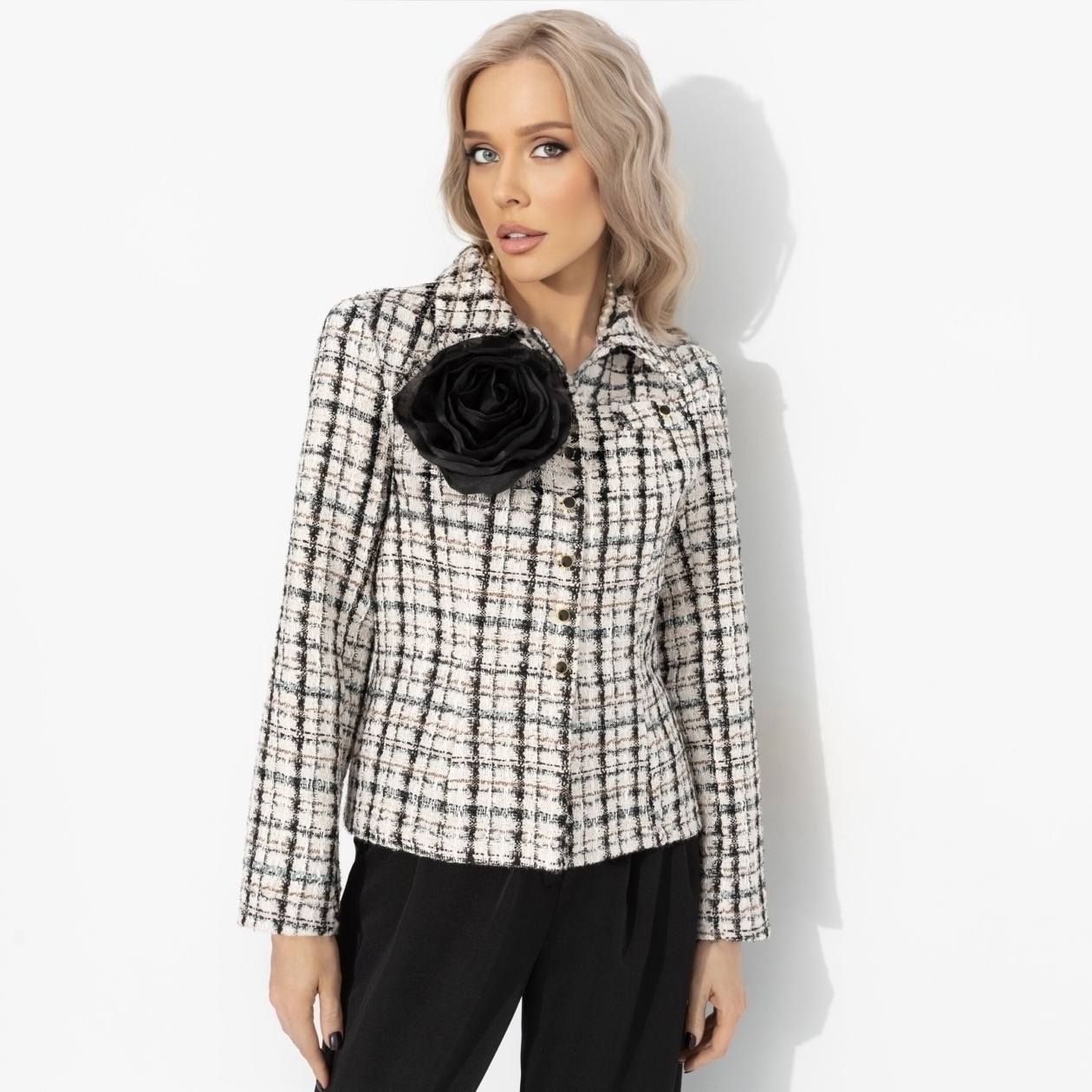 Жакет из твида «Шанель» с богатой цветовой палитрой от карамельно-розовых оттенков до черно-белых выглядит как уверенный ответ миру: женственно, но с характером. Глянцевые пуговицы в золотой огранке работают как точка в конце фразы – чётко и дорого. Натуральный состав (65% вискозы). Этот жакет решительный лидер в трендах сезона: твид, подчёркнутая талия и уверенное плечо. «Искра решимости» – когда вы не ждете одобрения. Вы его создаёте.
