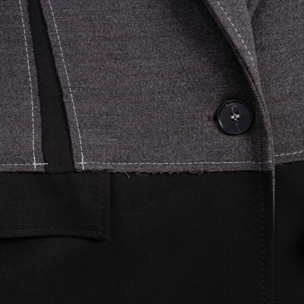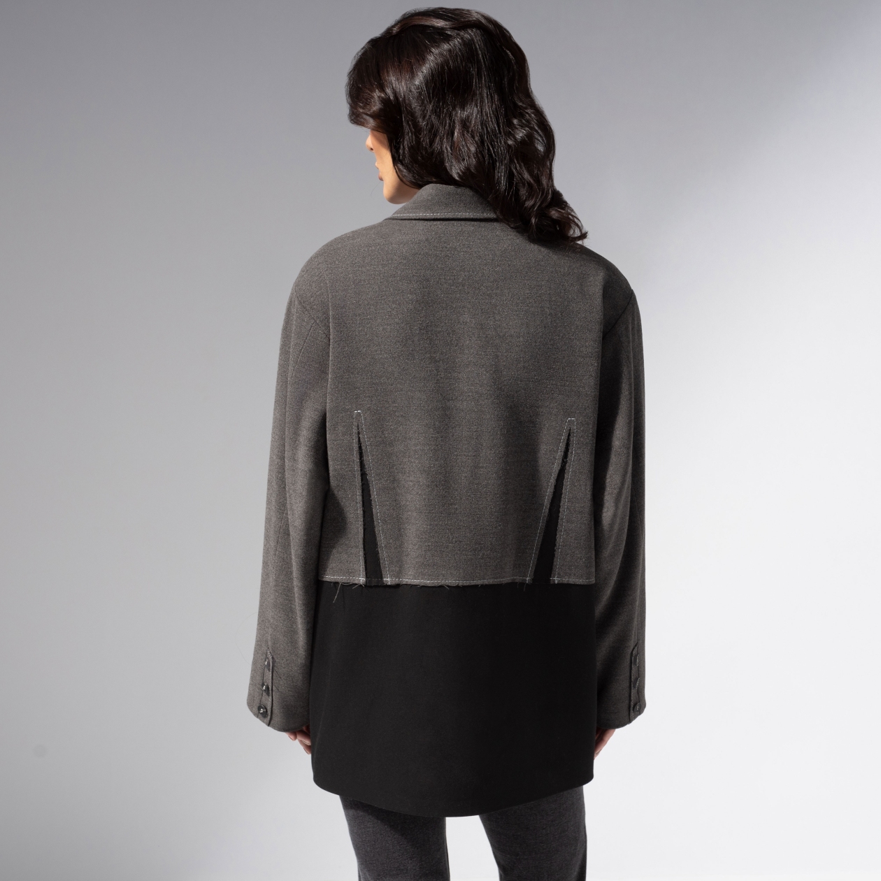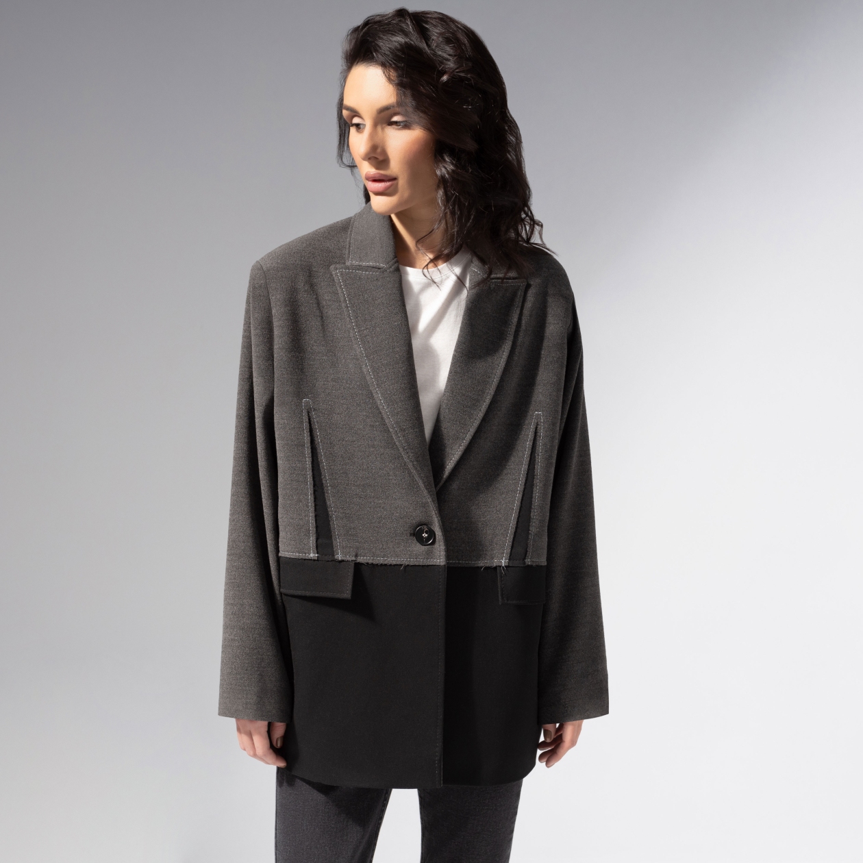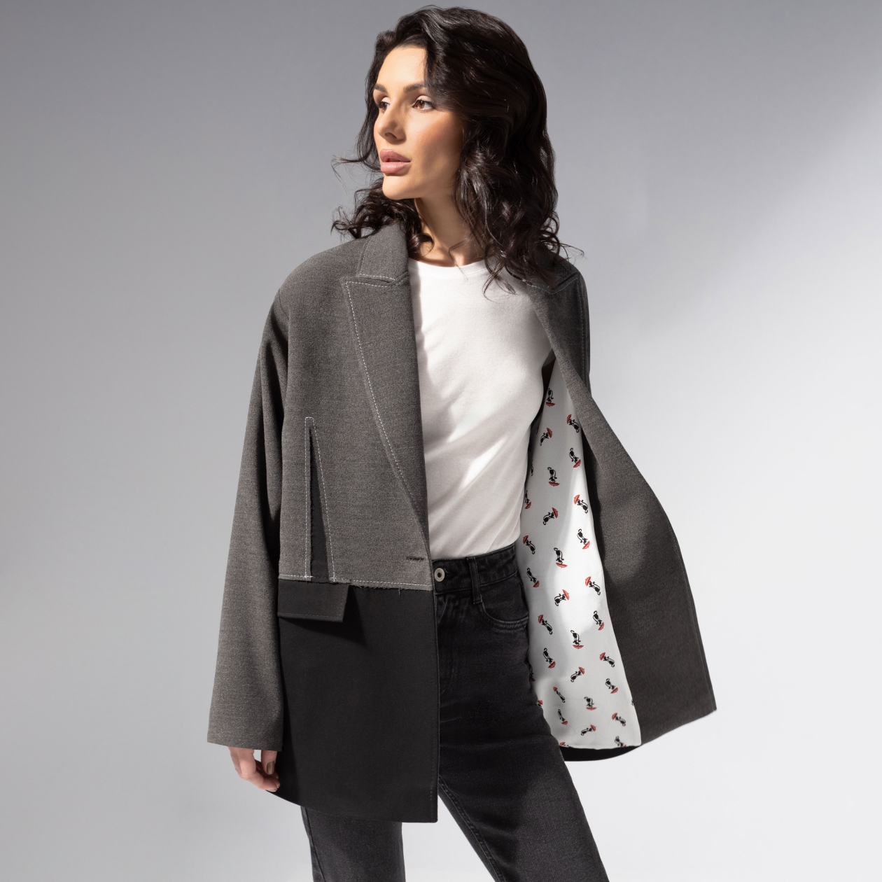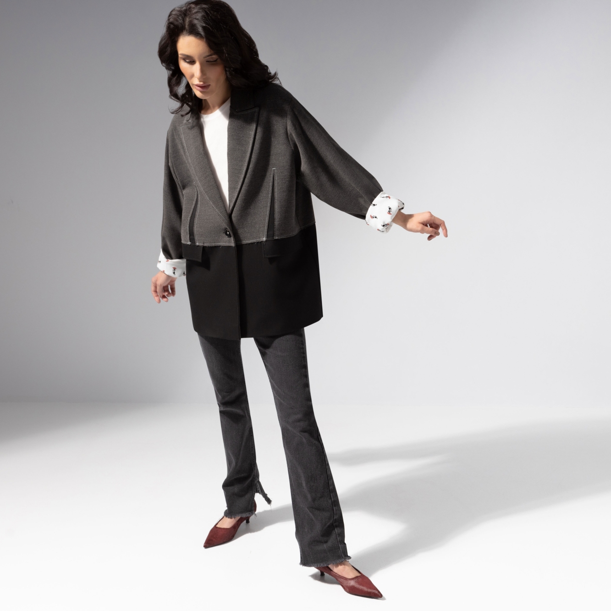 В жизни, как в шахматах, решительный ход делает сильная фигура. Жакет ЧАРУТТИ – про уверенность и умение управлять вниманием. Монохром, игра фактур и архитектурный крой – всё, что нужно для победного образа. Комбинированный жакет из двух видов костюмной ткани. Чёткая линия плеч, свободный силуэт, застёжка на одну пуговицу. Акцентные швы и геометричные вставки.