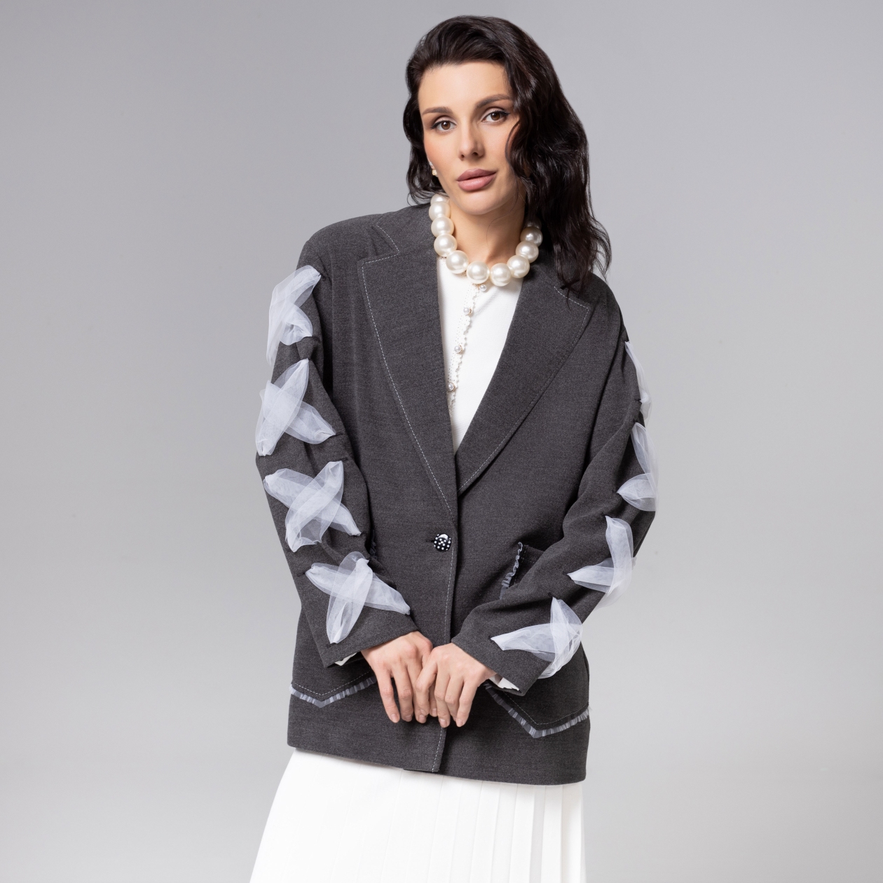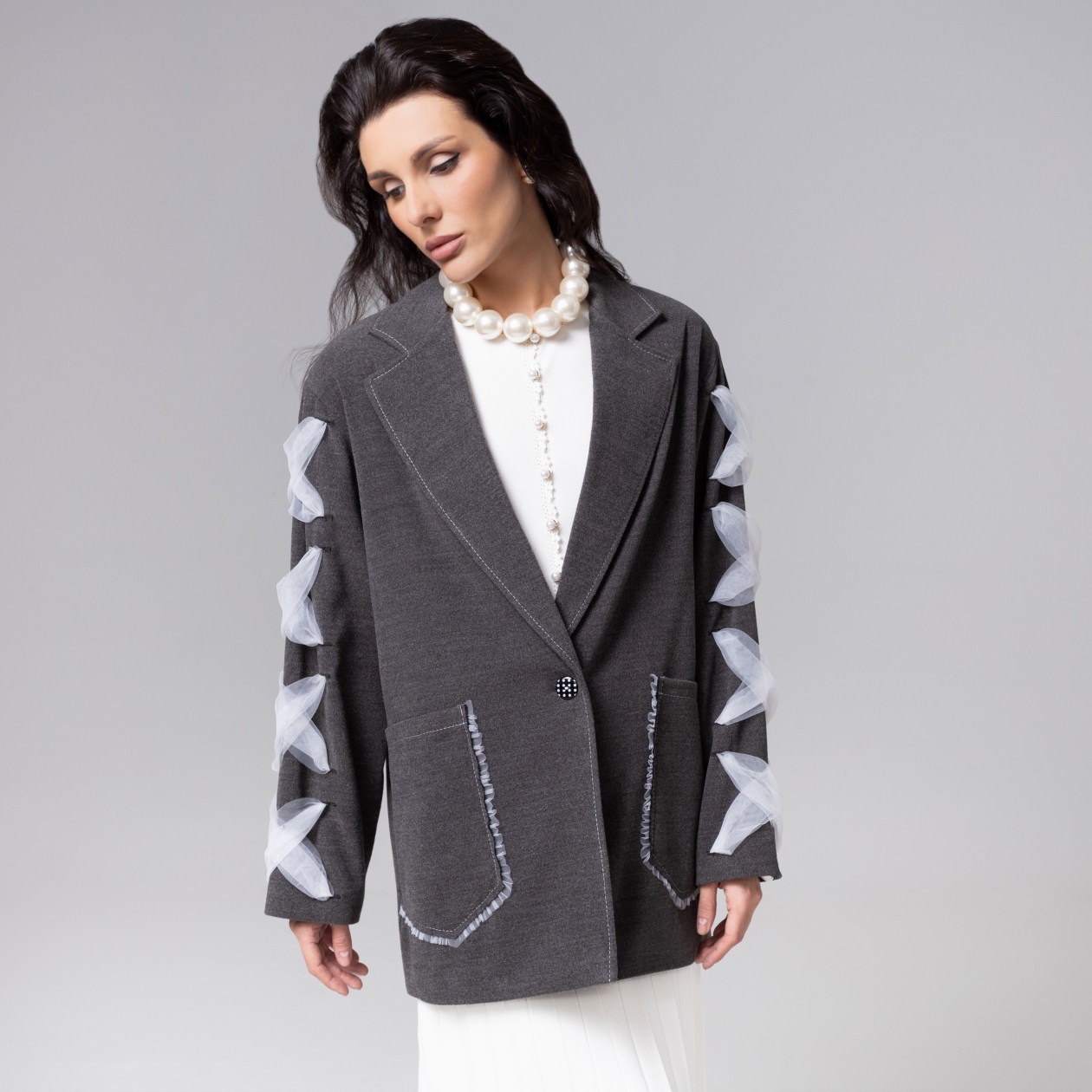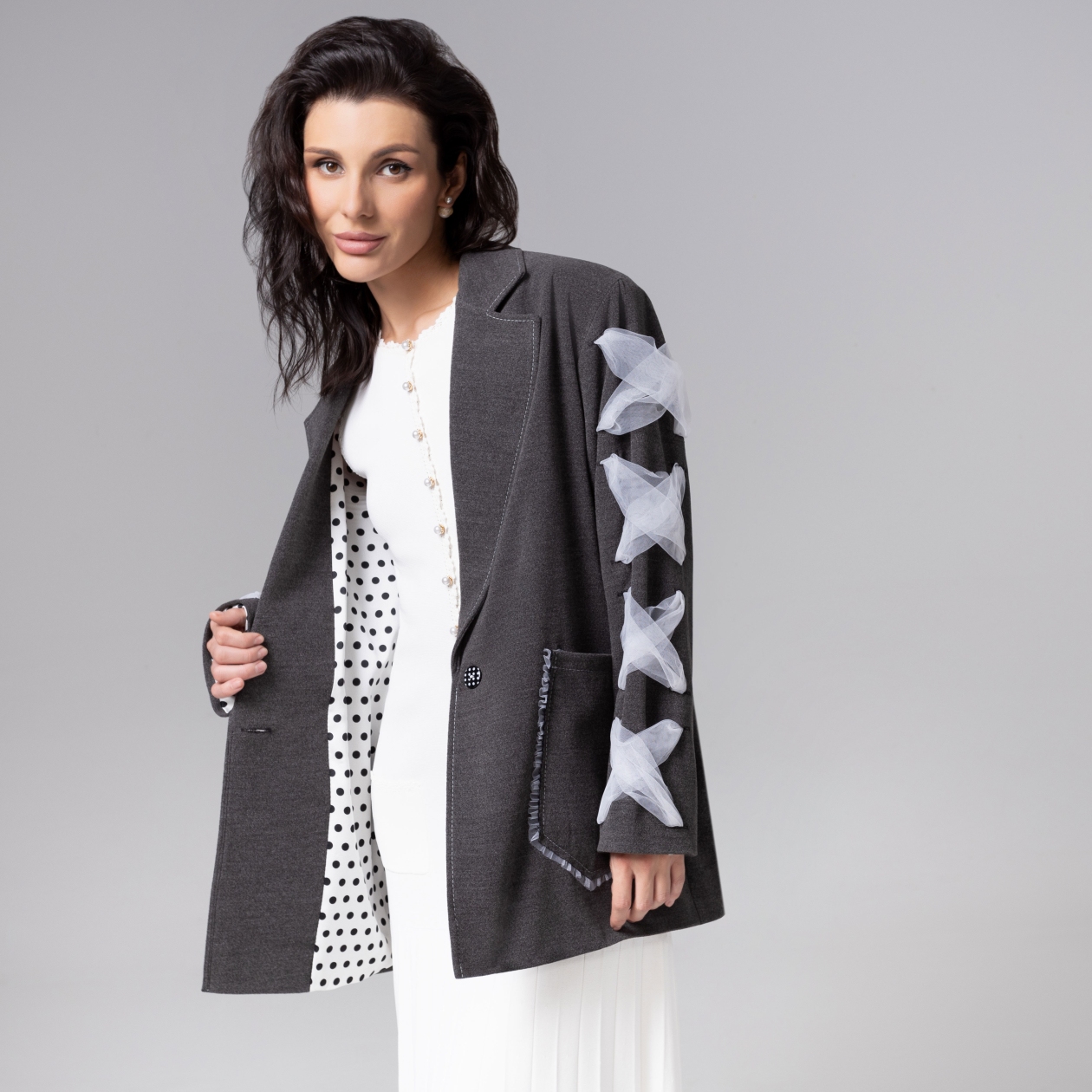 Жакет ЧАРУТТИ из коллекции PREMIUM свободного кроя с акцентными лентами на рукавах представляет собой воплощение новаторского дизайна. Художественные детали гармонично сочетаются с функциональностью. Креативный подход проявляется в игре фактур и динамике лент, которые добавляют образу авангардную выразительность. В самом деле, совершенная модель.