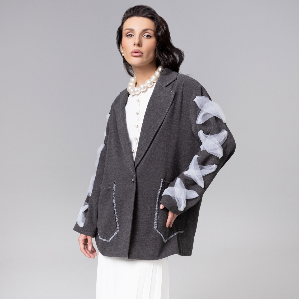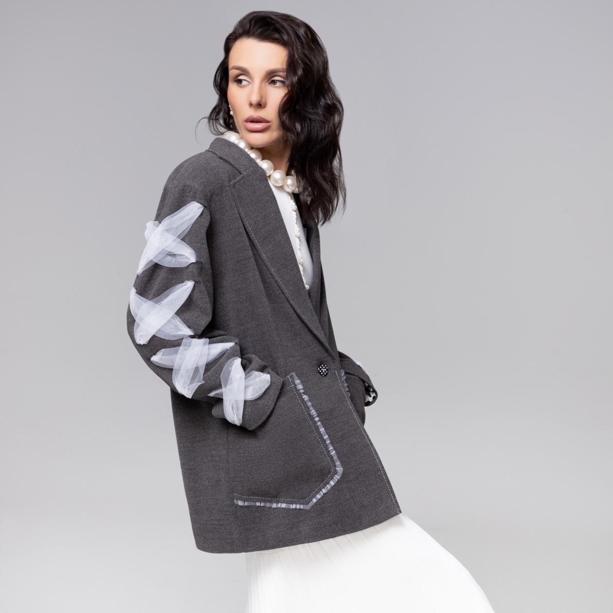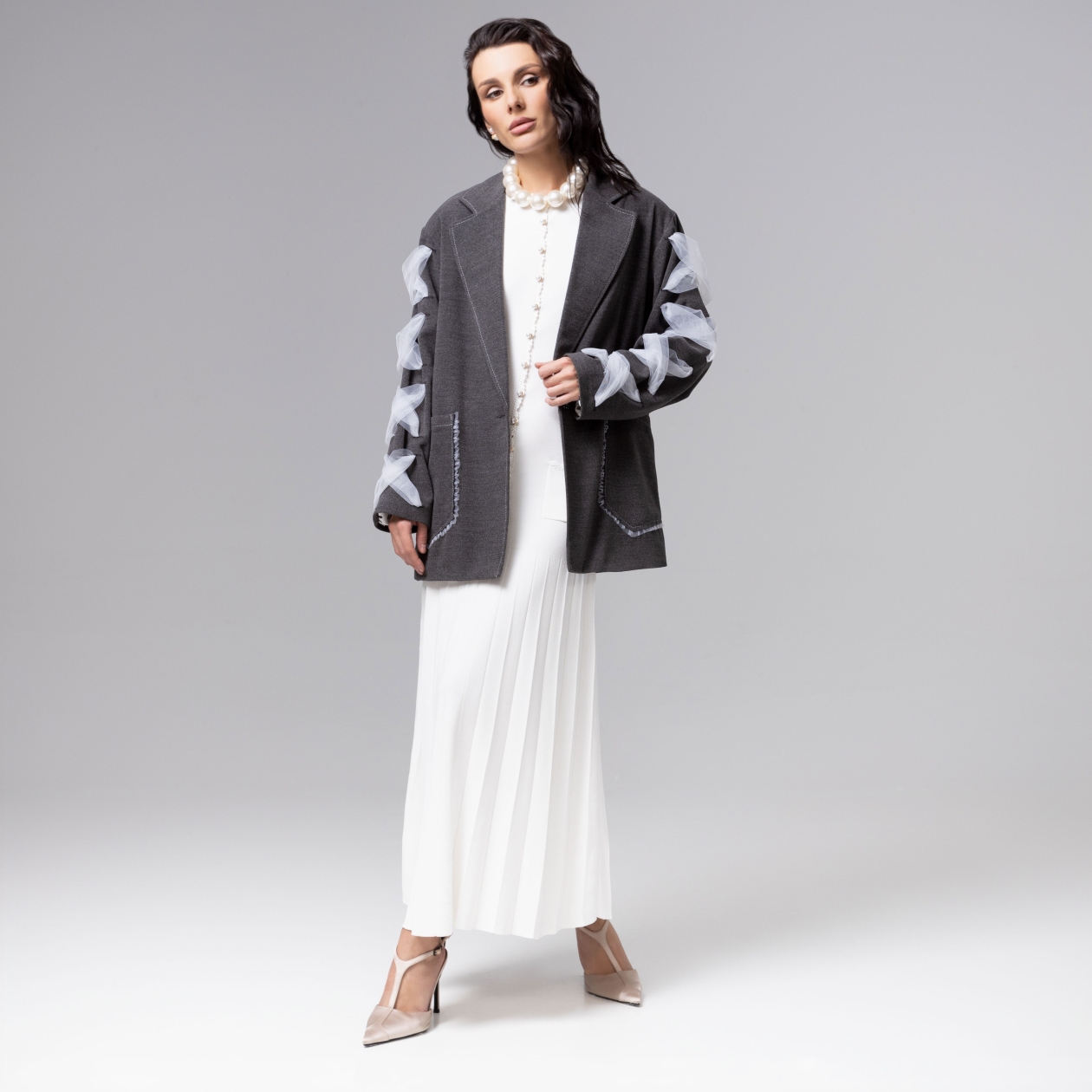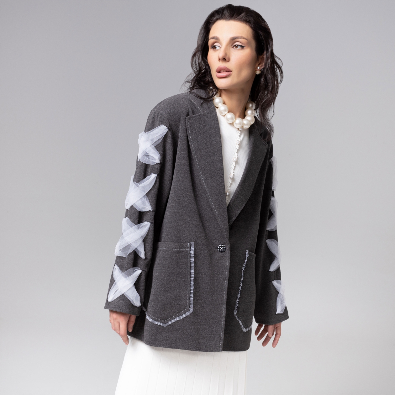 Жакет ЧАРУТТИ из коллекции PREMIUM свободного кроя с акцентными лентами на рукавах представляет собой воплощение новаторского дизайна. Художественные детали гармонично сочетаются с функциональностью. Креативный подход проявляется в игре фактур и динамике лент, которые добавляют образу авангардную выразительность. В самом деле, совершенная модель.