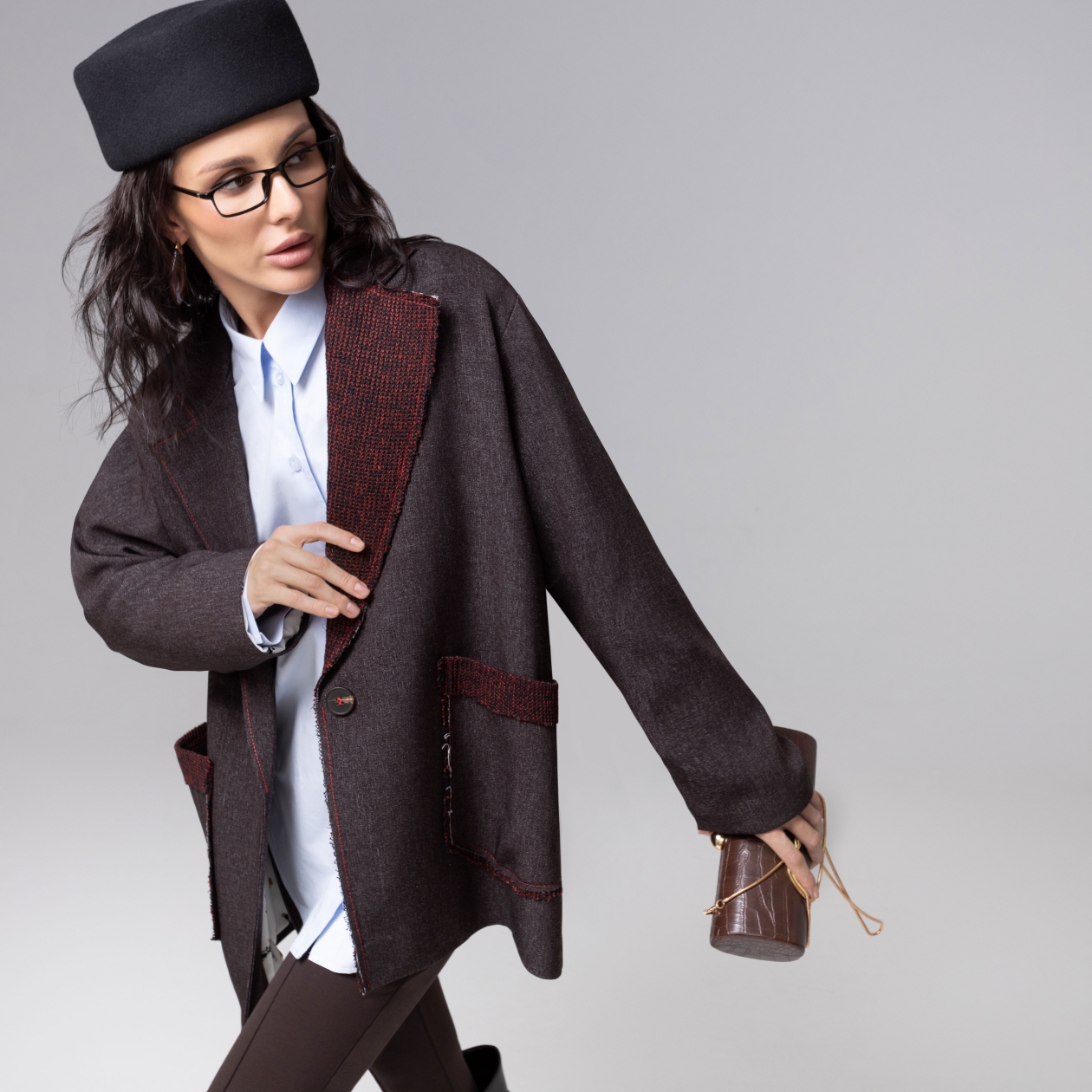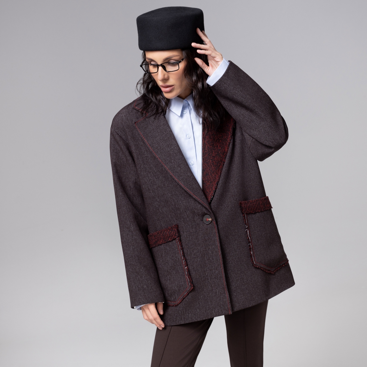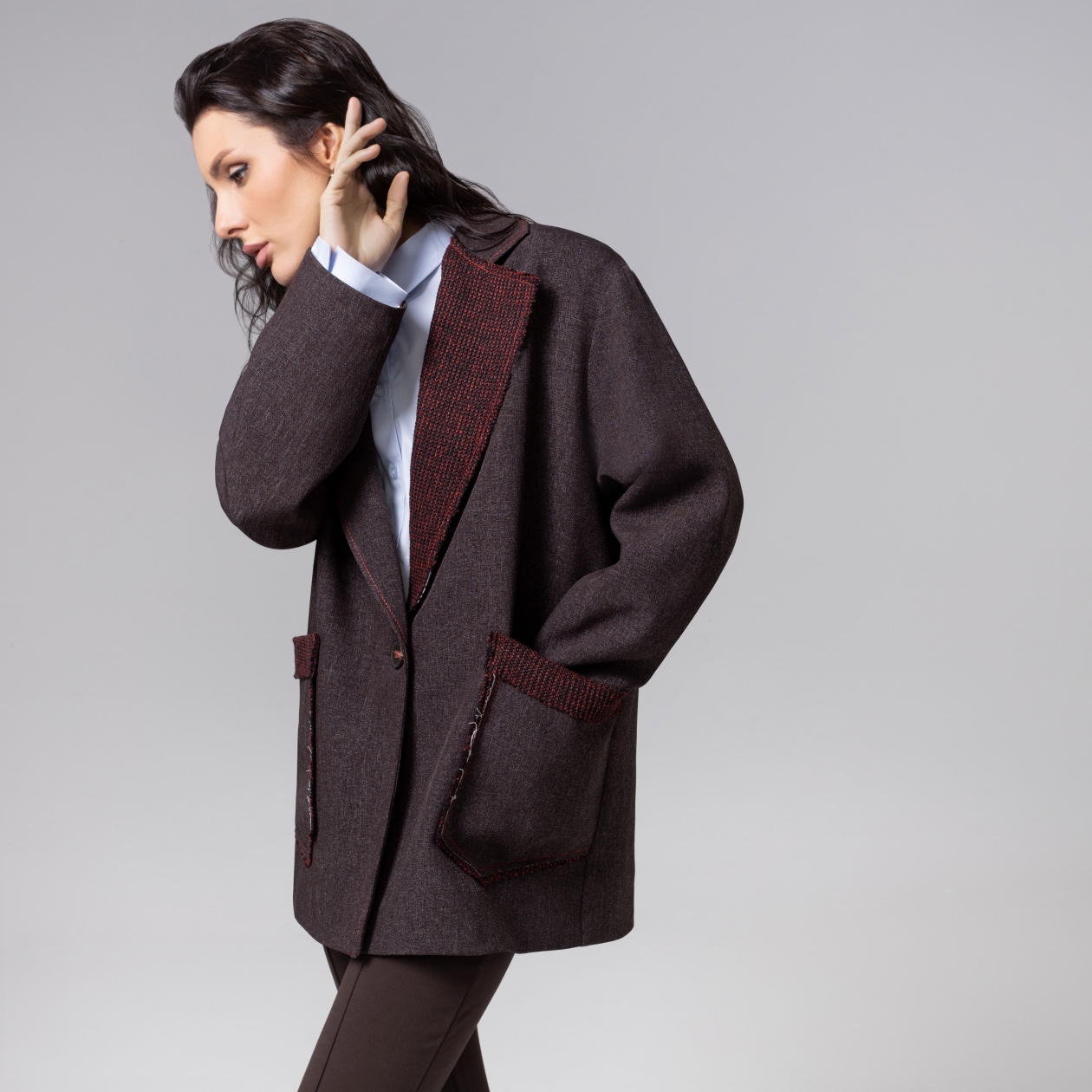Женский объемный жакет ЧАРУТТИ в глубоких коричнево-бордовых оттенках выполнен в стиле «с мужского плеча». Изделие сочетает в себе мощь классического кроя и утонченную элегантность. На спинке дизайнерский принт. Его модный силуэт, акцентированный выразительными лацканами и объемными карманами, подчеркивает хрупкость фигуры, создавая эффектный контраст. Высокое качество пошива проявляется в безупречной посадке, точном структурировании формы и использовании роскошных материалов. Продуманная конструкция с яркой износостойкой подкладкой обеспечивает комфорт и сохраняет безупречный вид даже при длительном ношении. Ткань с легким блеском. Жакет с подплечниками.