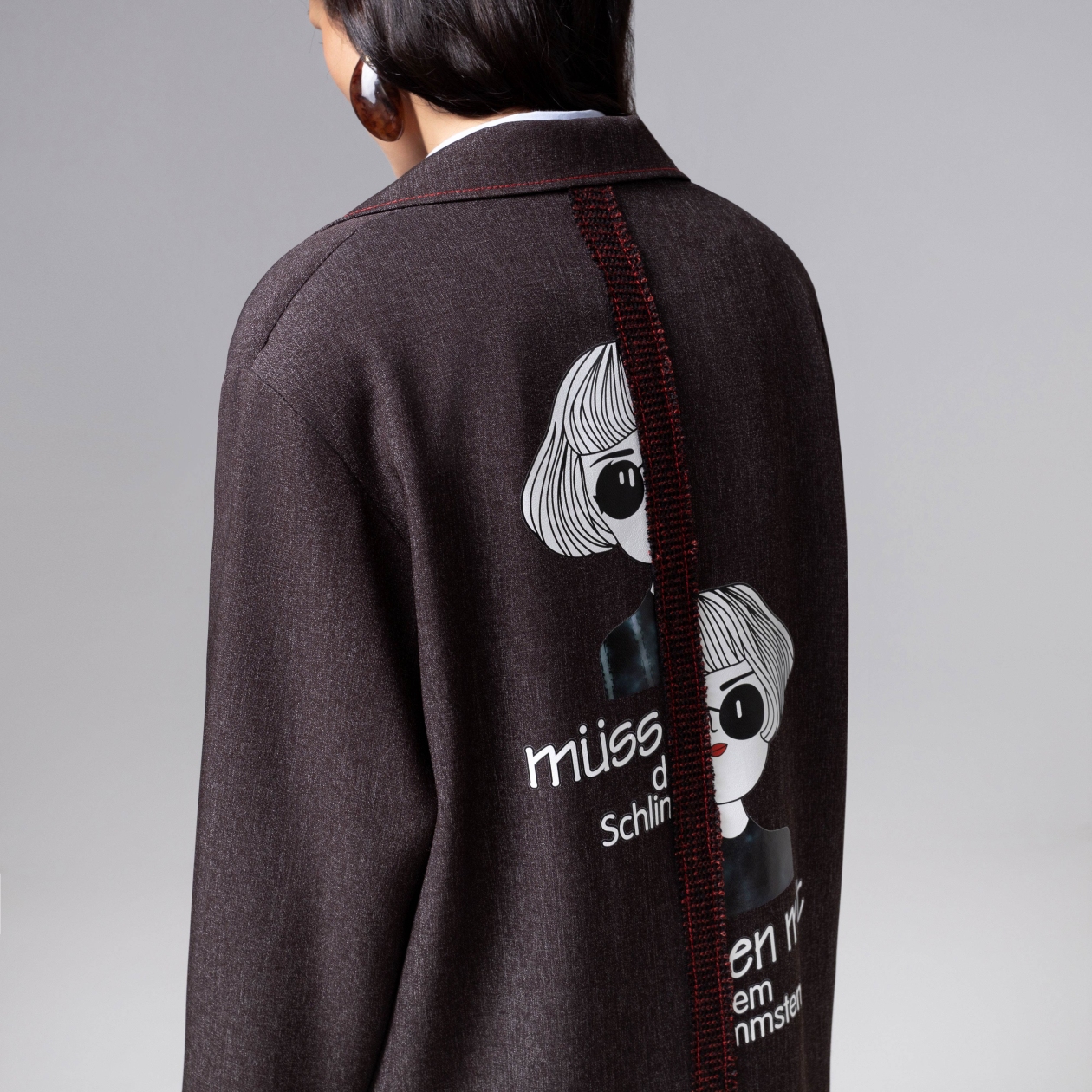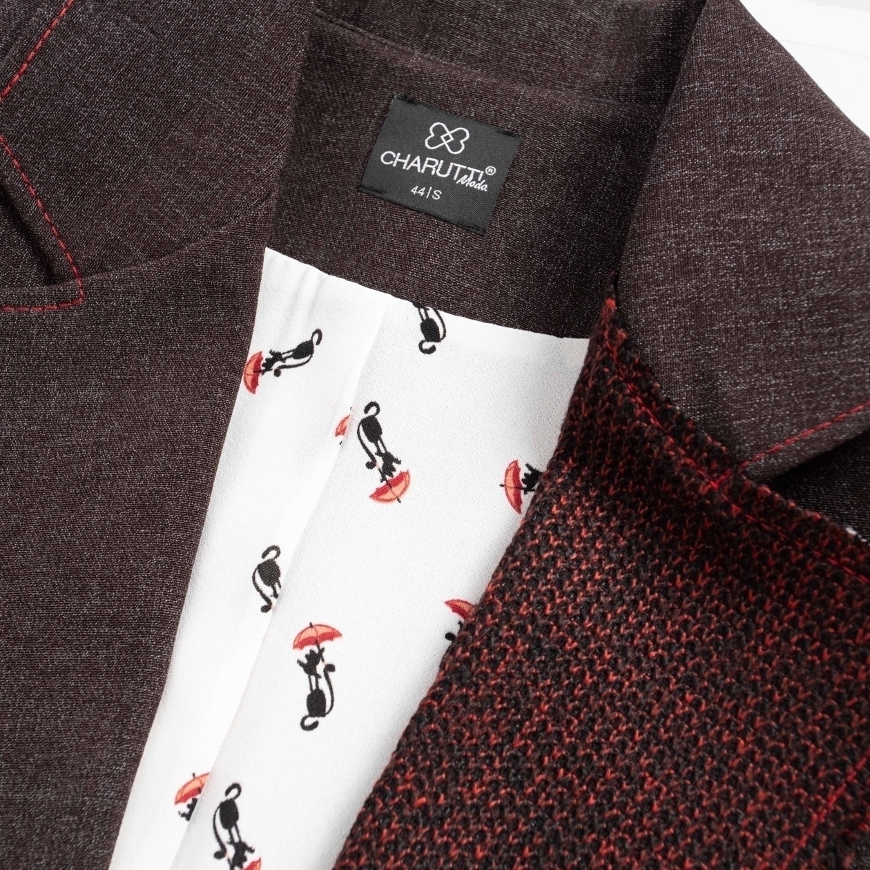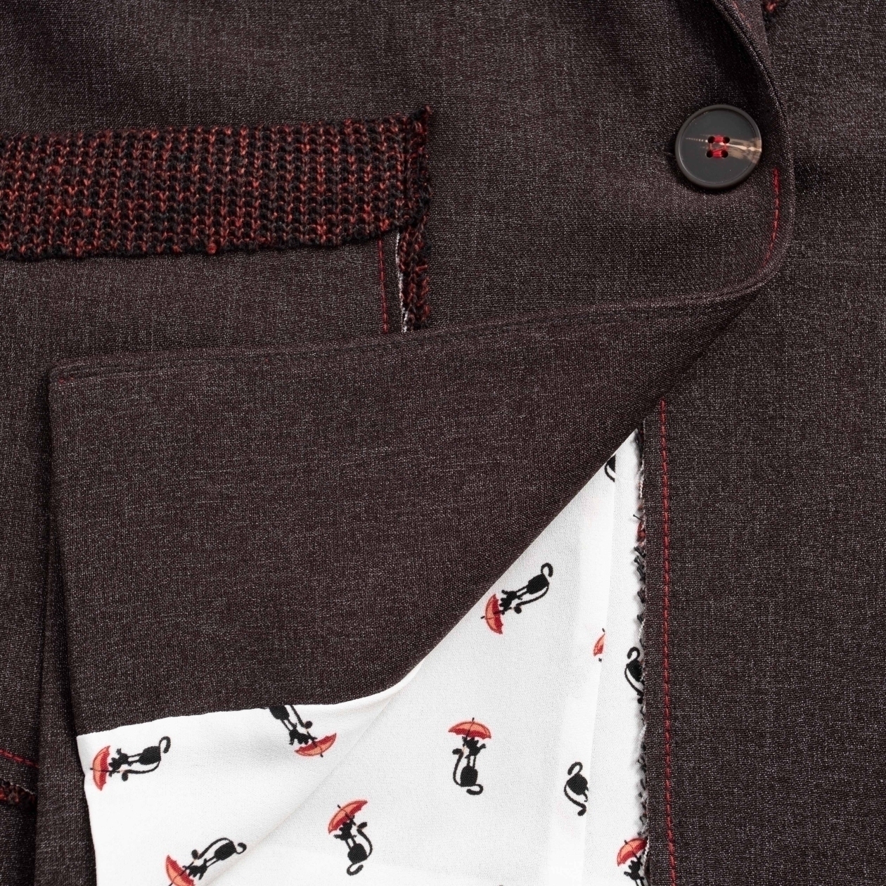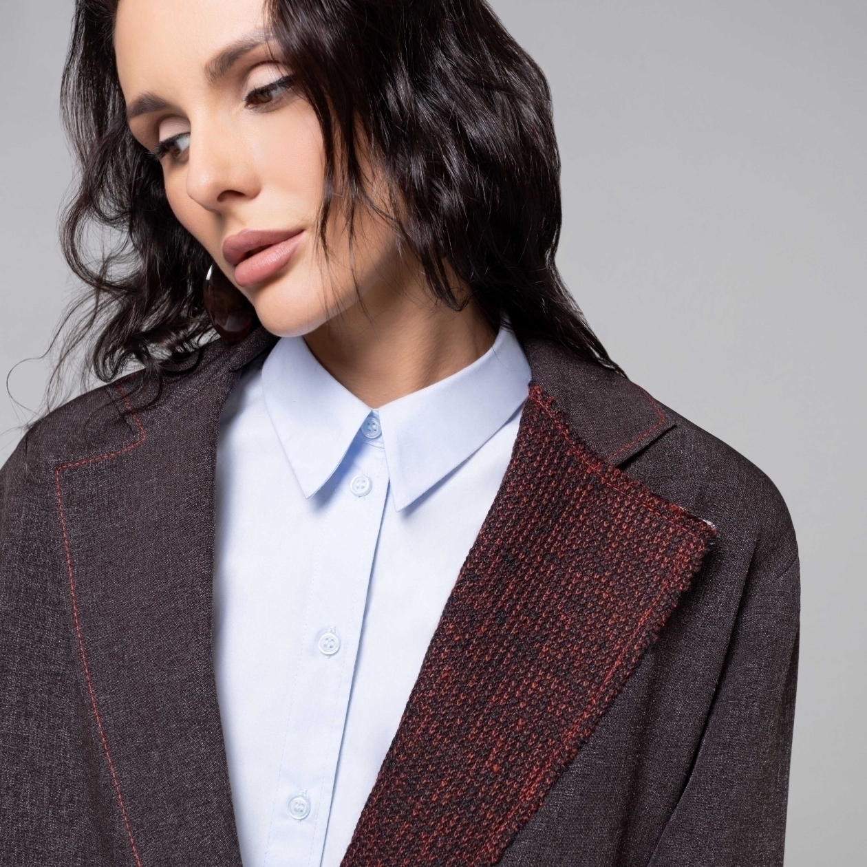 Женский объемный жакет ЧАРУТТИ в глубоких коричнево-бордовых оттенках выполнен в стиле «с мужского плеча». Изделие сочетает в себе мощь классического кроя и утонченную элегантность. На спинке дизайнерский принт. Его модный силуэт, акцентированный выразительными лацканами и объемными карманами, подчеркивает хрупкость фигуры, создавая эффектный контраст. Высокое качество пошива проявляется в безупречной посадке, точном структурировании формы и использовании роскошных материалов. Продуманная конструкция с яркой износостойкой подкладкой обеспечивает комфорт и сохраняет безупречный вид даже при длительном ношении. Ткань с легким блеском. Жакет с подплечниками.