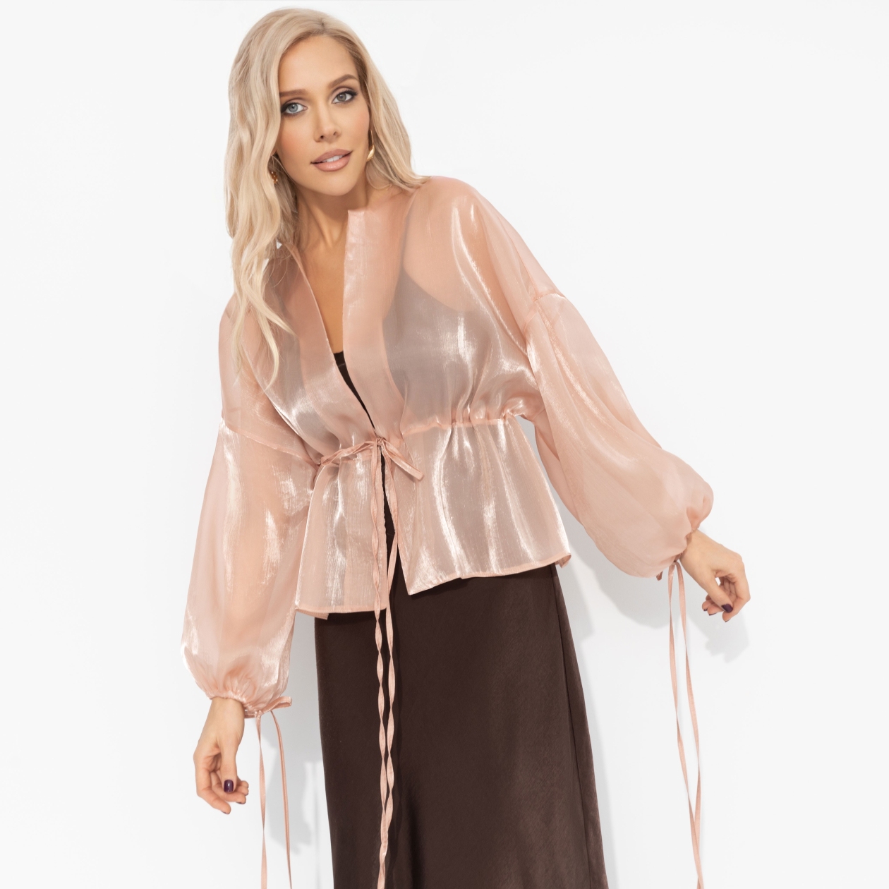 Такой важный день она решила встретить в утонченной нежности, выбрав жакет ЧАРУТТИ из струящейся органзы пудрового оттенка. Невесомый крой и мягкий цвет создавали образ одновременно торжественный и безмятежный, как утро ее главного дня. Объемные рукава, похожие на лепестки пиона, обволакивали каждое её движение. В этом наряде она чувствовала ту гармонию и внутреннее спокойствие, которые должны были стать залогом её успеха. Жакет объемного кроя. Есть регулируемая кулиска на талии. Линия плеча спущена. Есть шнуровка по манжетам. Материал изделия слегка просвечивает, с блеском.