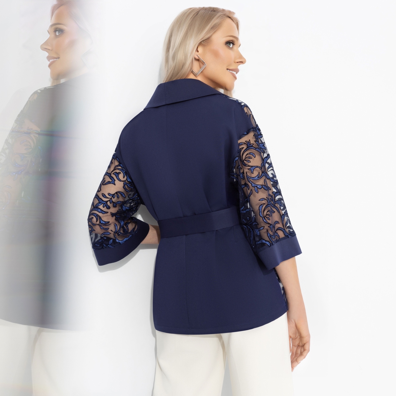 Судьба любит тех, кто решается быть настоящей. Этот синий жакет ЧАРУТТИ создан для самых неожиданных поворотов – кружево на сетке напоминает переплетение историй, где каждый ваш шаг становится новым главой. В таких образах случайная встреча превращается в судьбоносный момент. Жакет из костюмной ткани с ажурной синей сеткой, подойдет обладательнице любого типа фигуры. Стилисты рекомендуют жакет как для нарядных выходов, так и для смелых экспериментов с образами на каждый день.