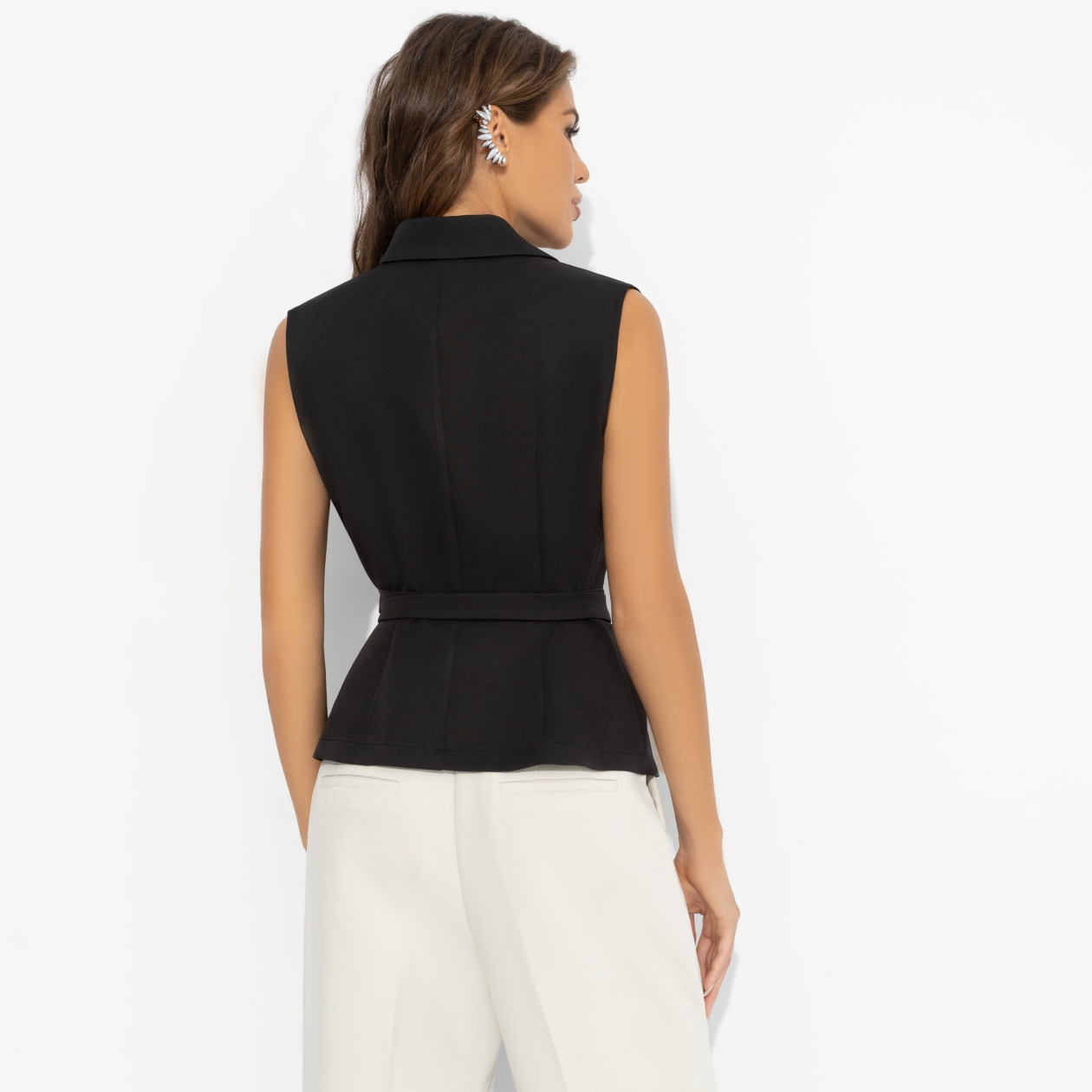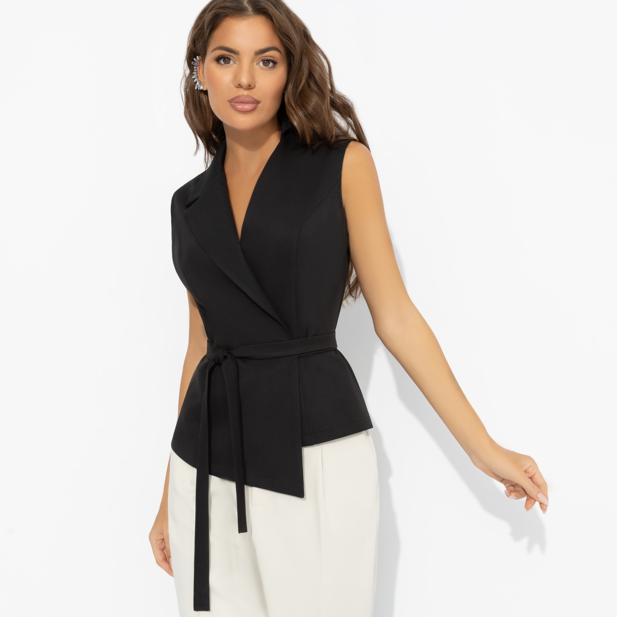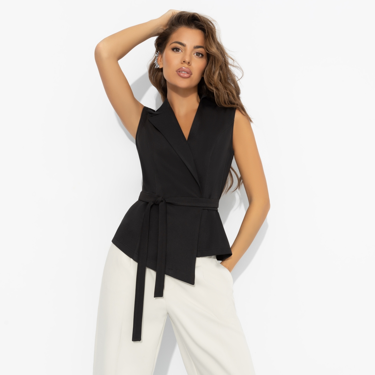 Мягкая драма, визуальная чёткость и деликатная женственность ‒ удивляй всех грацией, словно на сцене во время награждения. В сочетании с белыми брюками (или любимыми джинсами) жилет делает тебя объектом восхищённых взглядов. Приталенный жилет без рукавов, с запахом и поясом на талии ‒ идеально скульптурирует силуэт. Выполнен из костюмной ткани ‒ лёгкой, пластичной и гладкой. Универсальный чёрный цвет для самых смелых миксов.